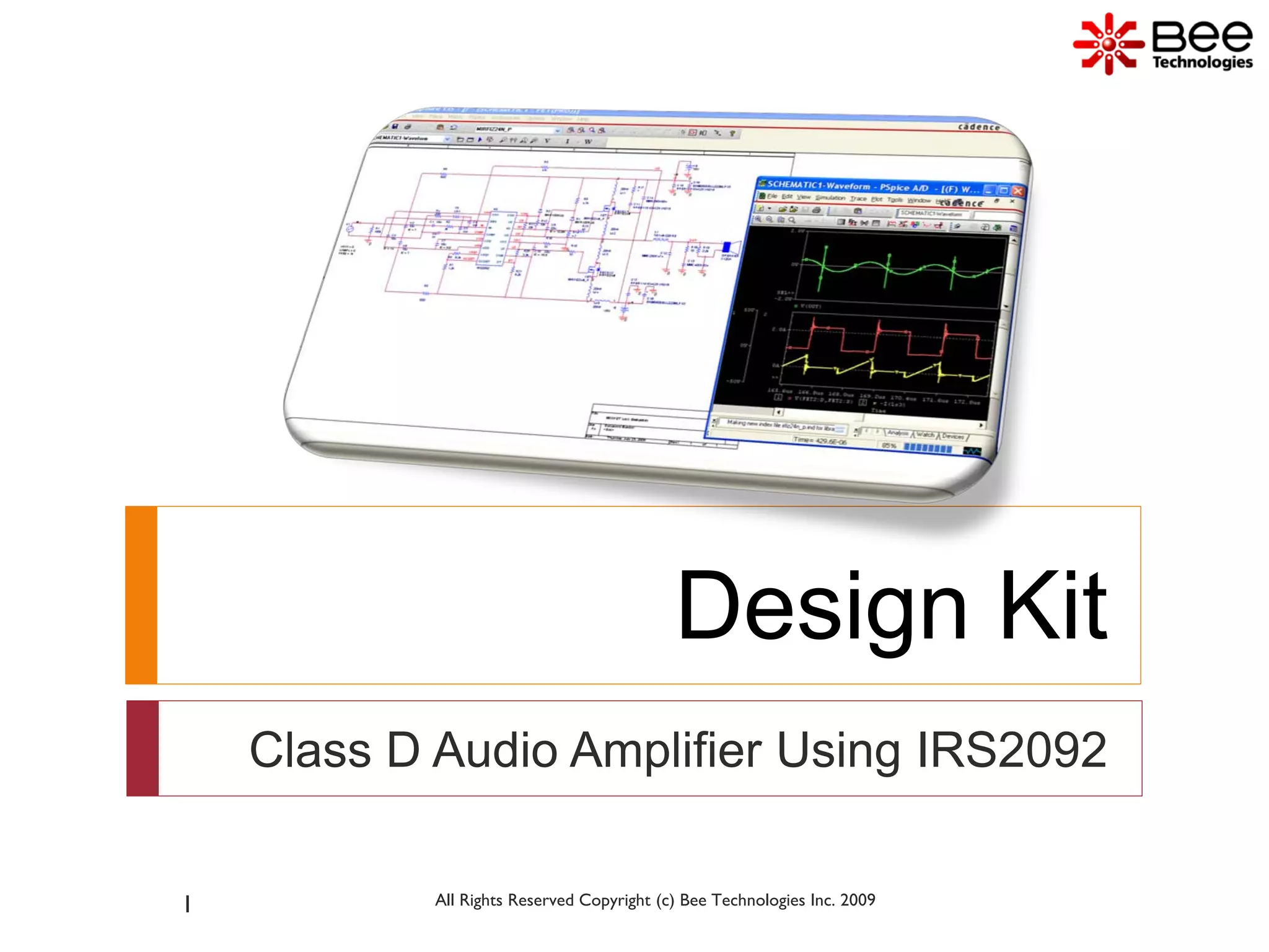 The document provides specifications for a class D audio amplifier circuit using an IRS2092 integrated circuit. It includes 3 sentences summarizing key points: