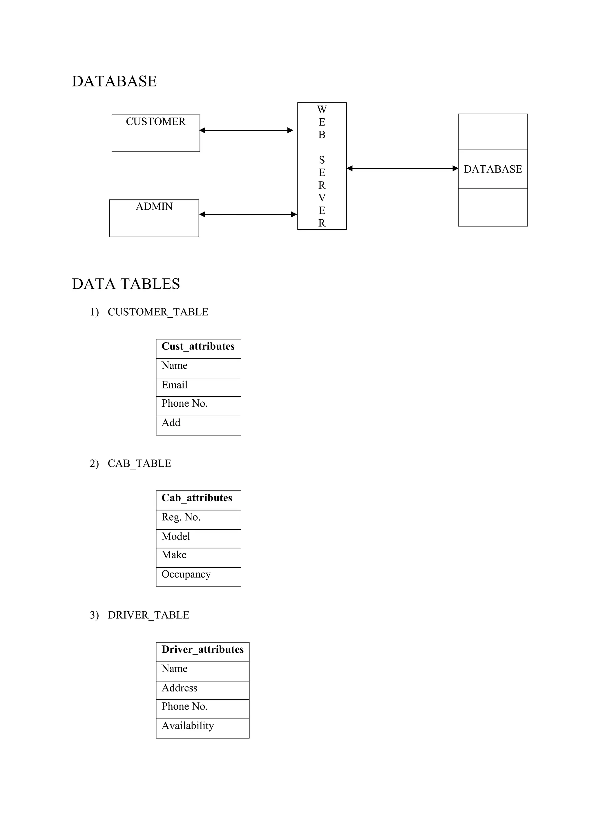The document describes a database for a cab booking system. It includes three data tables: Customer, Cab, and Driver. It also includes a class diagram with classes for Customer, Cab, Booking, and other entities. Finally, it lists four database operations: creation, selection, deletion, and modification.