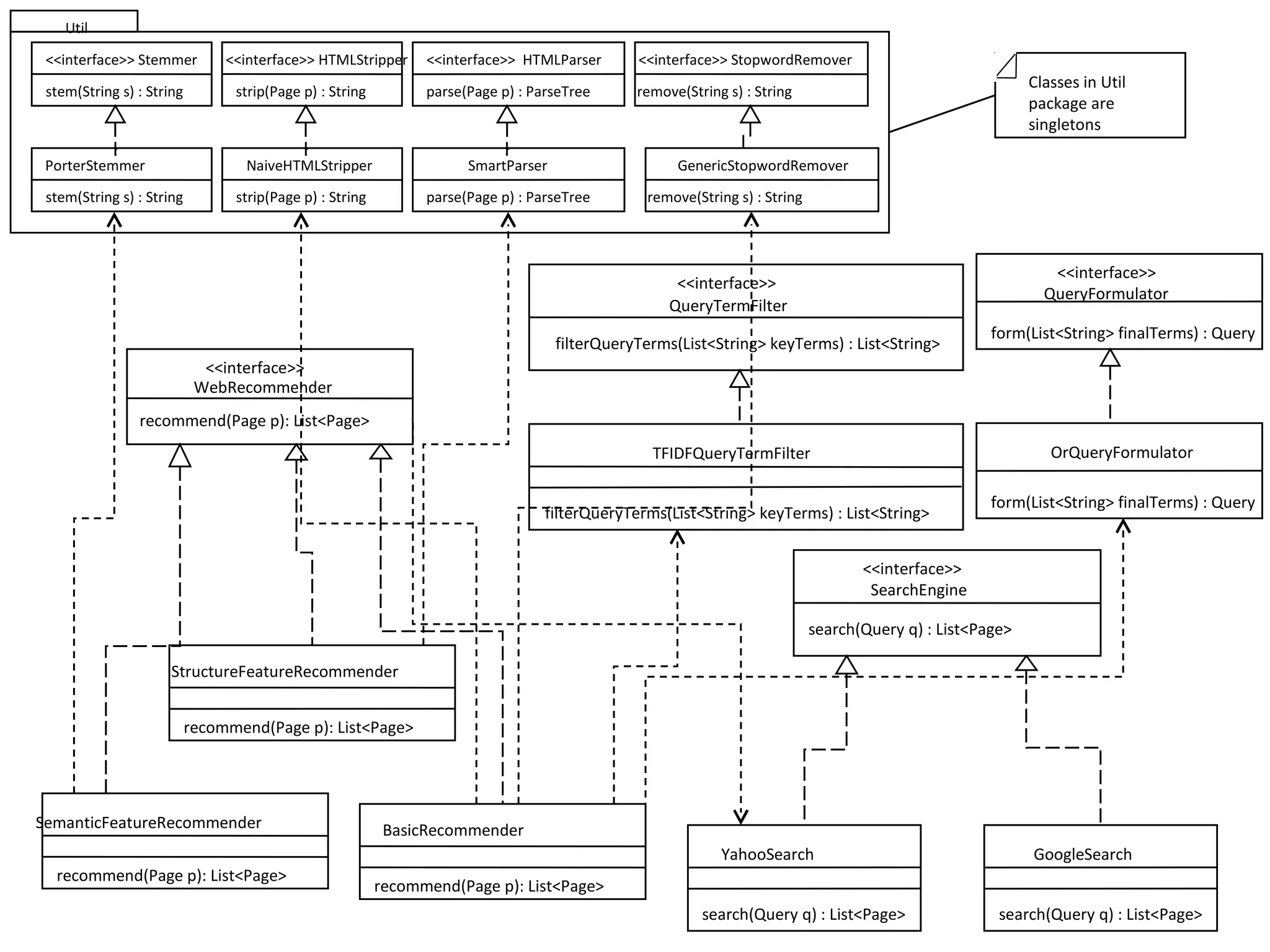Util <<interface>> SearchEnginesearch(Query q) : List<Page> StructureFeatureRecommender recommend(Page p): List<Page> SemanticFeatureRecommender recommend(Page p): List<Page> YahooSearch search(Query q) : List<Page> BasicRecommender recommend(Page p): List<Page> <<interface>> WebRecommender recommend(Page p): List<Page> GoogleSearch search(Query q) : List<Page> <<interface>> Stemmer stem(String s) : String <<interface>> HTMLStripper strip(Page p) : String <<interface>> HTMLParser parse(Page p) : ParseTree <<interface>> StopwordRemover remove(String s) : String <<interface>> QueryTermFilter filterQueryTerms(List<String> keyTerms) : List<String> TFIDFQueryTermFilter filterQueryTerms(List<String> keyTerms) : List<String> Classes in Util package are singletons QueryFormulator form(List<String> finalTerms) : Query <<interface>> OrQueryFormulator form(List<String> finalTerms) : Query PorterStemmer stem(String s) : String NaiveHTMLStripper strip(Page p) : String SmartParser parse(Page p) : ParseTree GenericStopwordRemover remove(String s) : String
