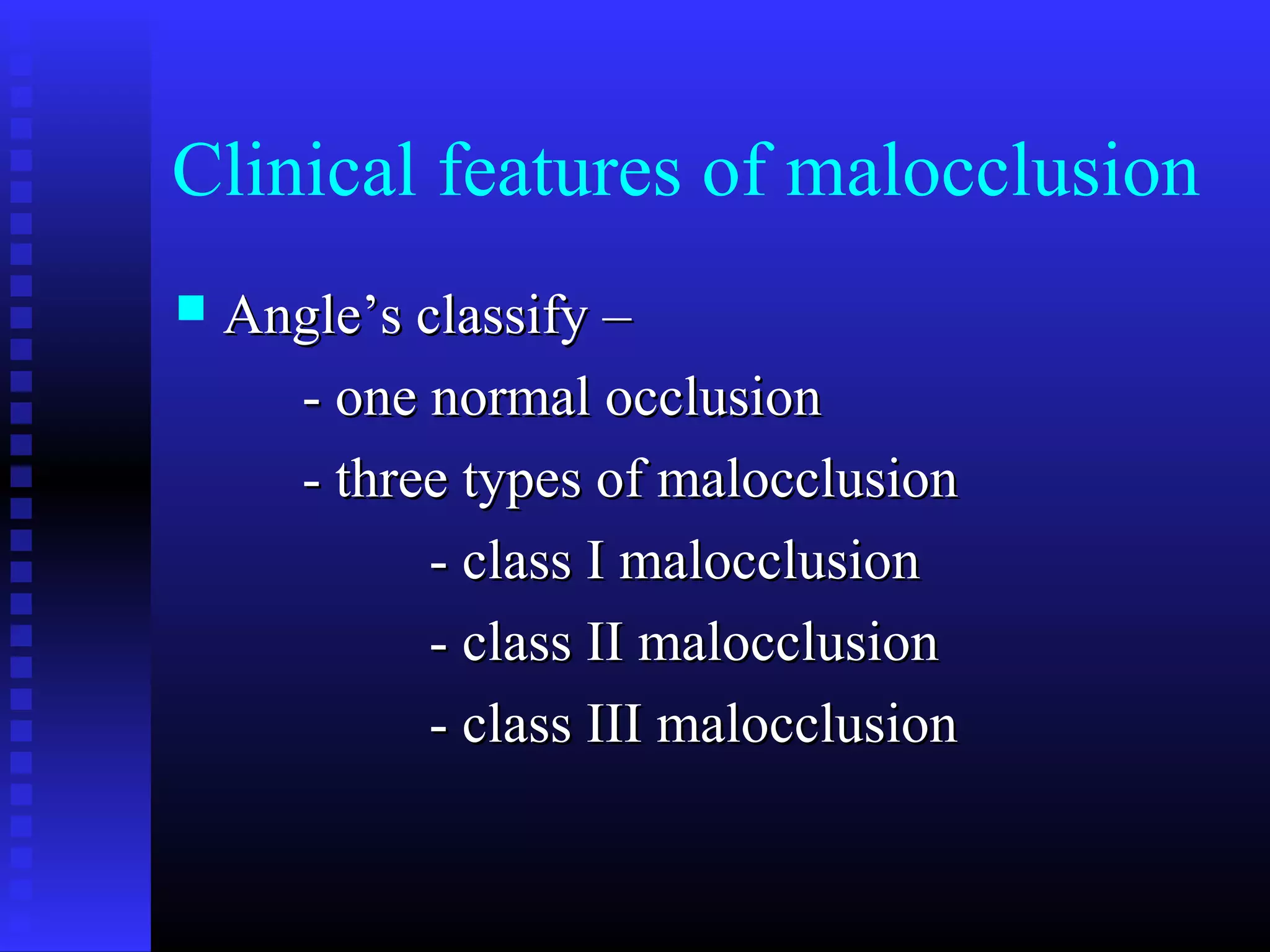 The document discusses the clinical features of malocclusion, particularly focusing on Angle's classification, which includes normal occlusion, Class I, II, and III malocclusions. Class I malocclusions generally have normal anteroposterior relationships but may show transverse or vertical discrepancies, with complications like crowding or spacing. The skeletal and facial growth patterns are typically stable, but issues can arise from dentoalveolar adaptations and soft tissue characteristics.