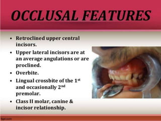 Class II division 2 malocclusion is characterized by retroclined upper incisors with minimal overjet and deep overbite. It has a prevalence of 10% in Caucasian populations. There are three types based on spatial conditions in the maxilla. Treatment aims to improve aesthetics, function, relieve crowding, and reduce overbite. Options include no treatment, removable appliances, single/twin fixed appliances, functional appliances, and orthognathic surgery. Stability can be an issue after treatment, especially for lateral incisor alignment and overbite correction.
