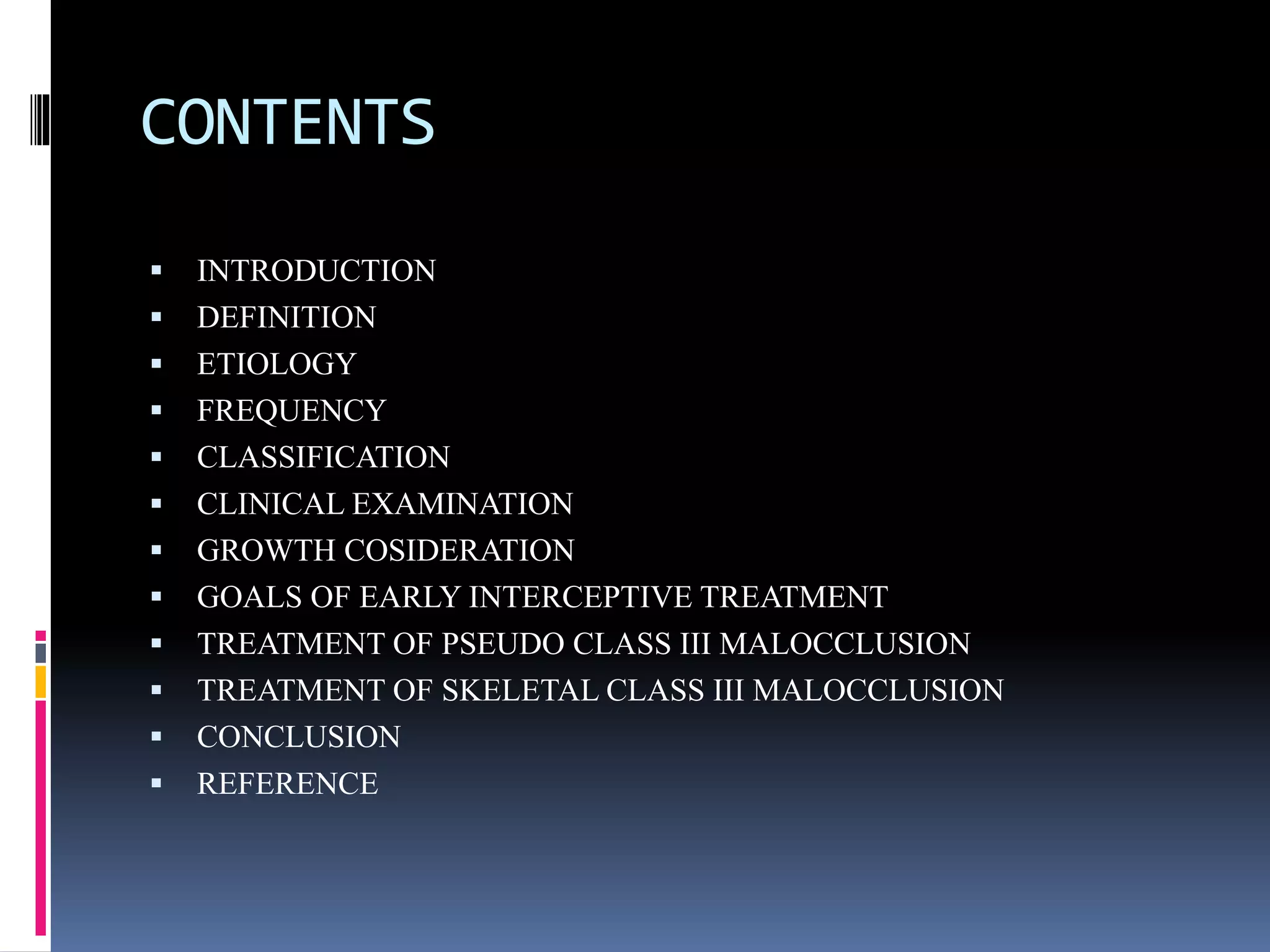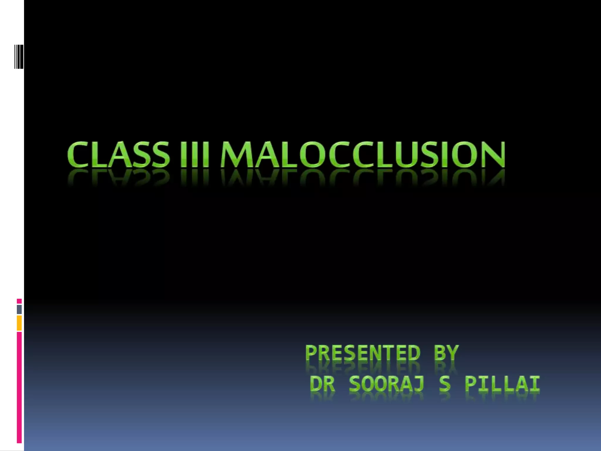 This document provides an overview of class III malocclusions, including definition, etiology, classification, clinical examination, and treatment approaches. It discusses pseudo and skeletal class III malocclusions. Treatment options covered include functional appliances like Frankel III regulator, chin cup, and face mask therapy. It also discusses camouflage treatment approaches like non-extraction and extraction methods. The goal of early interceptive treatment is preventing worsening and providing favorable growth. Functional appliances aim to redirect mandibular growth. Camouflage treatments disguise the underlying skeletal deformity through dental movements.