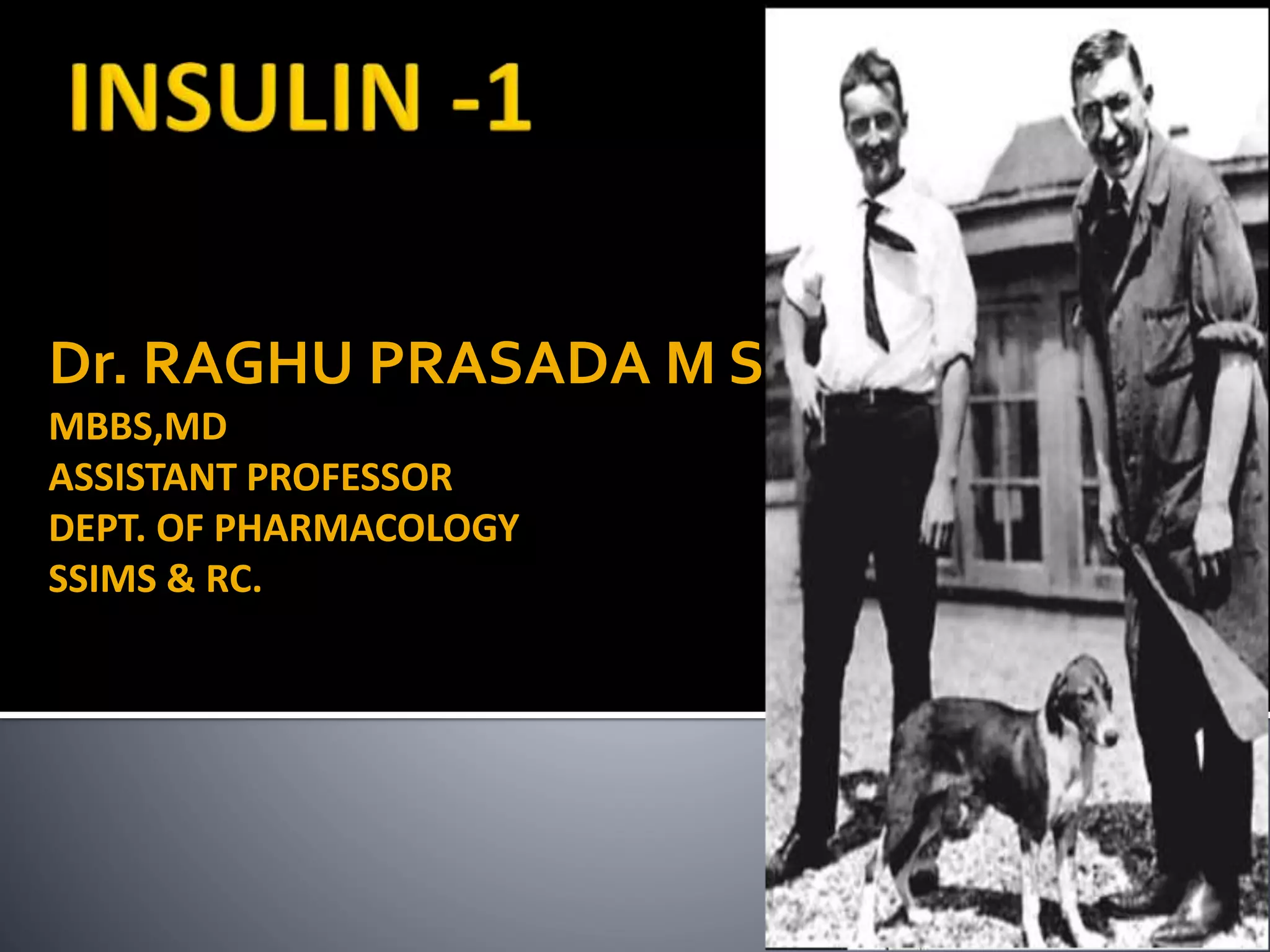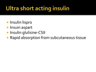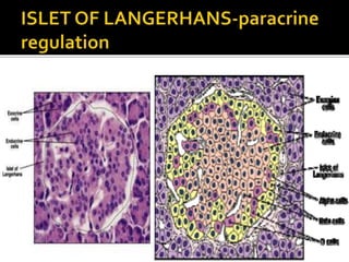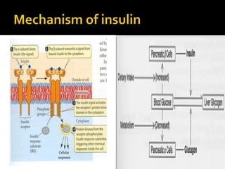 This document discusses the pancreas and its exocrine and endocrine functions. It focuses on the production and regulation of insulin in the pancreatic beta cells. Insulin regulates glucose and lipid metabolism, protein synthesis, and the storage and use of nutrients in tissues. The mechanisms of insulin secretion and action are described. The types and uses of insulin preparations are outlined, as are the complications of diabetes and methods for monitoring glucose control. Other diabetes medications like GLP-1 agonists are also briefly mentioned.