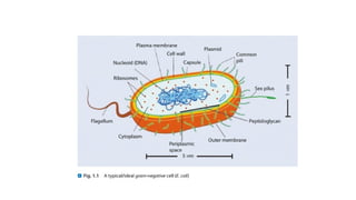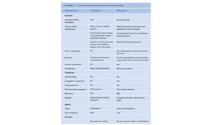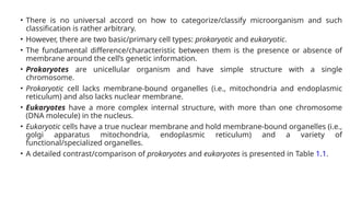 The document describes the classification of microorganisms, highlighting the distinction between prokaryotic and eukaryotic cells based on their structural features, such as the presence of a nuclear membrane and organelles. It outlines key characteristics of eubacteria and archaebacteria, including their metabolism and classification, and details the various structures found in prokaryotes. Additionally, it provides an overview of eukaryotic cells, emphasizing their complexity, organelles, and variations in cell walls.