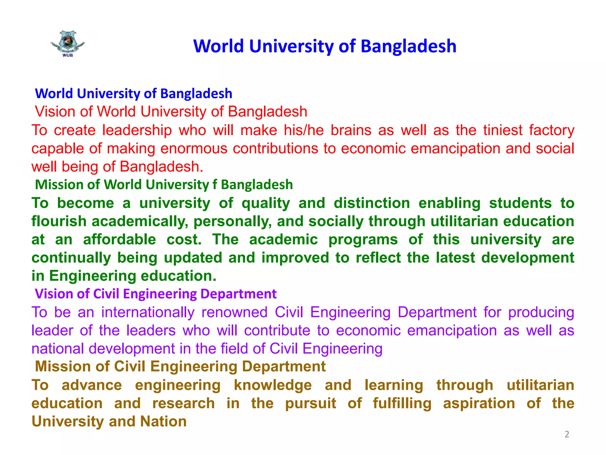 The document outlines a course on Irrigation and Flood Control (CE 1005) at the World University of Bangladesh, focusing on essential irrigation concepts, methods, design of irrigation structures, and flood control. The university's mission is to provide quality education for academic and personal growth while producing leaders in civil engineering for national development. Course outcomes include understanding various irrigation methods, crop water requirements, and designing relevant structures to enhance agricultural practices in the context of Bangladesh.