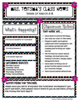 This week in Mrs. Teitsma's kindergarten class: they have been in school for 122 days, Zac was star of the week, they played a sight word game and are doing well with reading and writing sight words, they performed a poem about feelings and learned about the feeling of disappointment, and have been writing stories while also working on punctuation. Upcoming snacks are also noted.