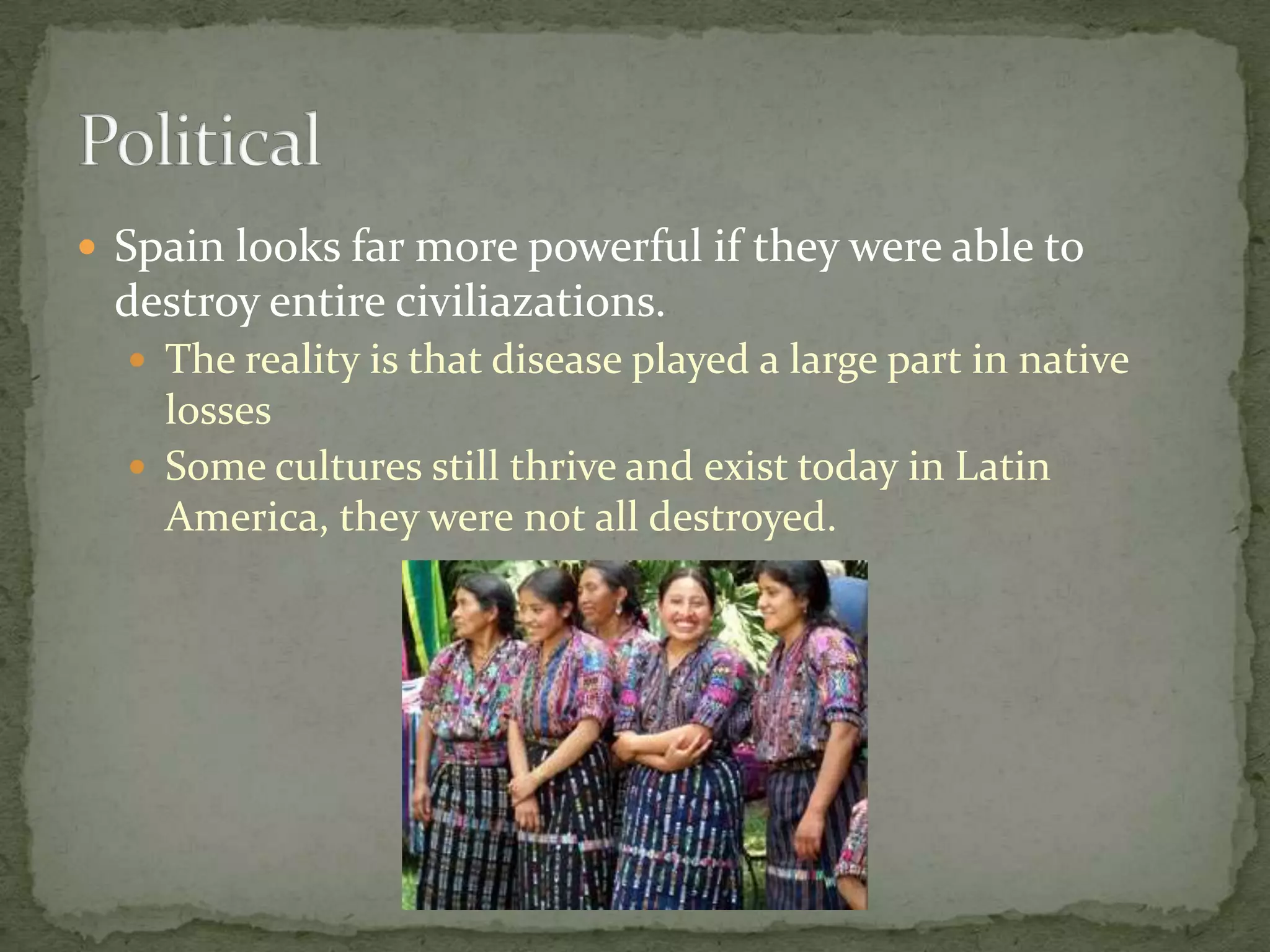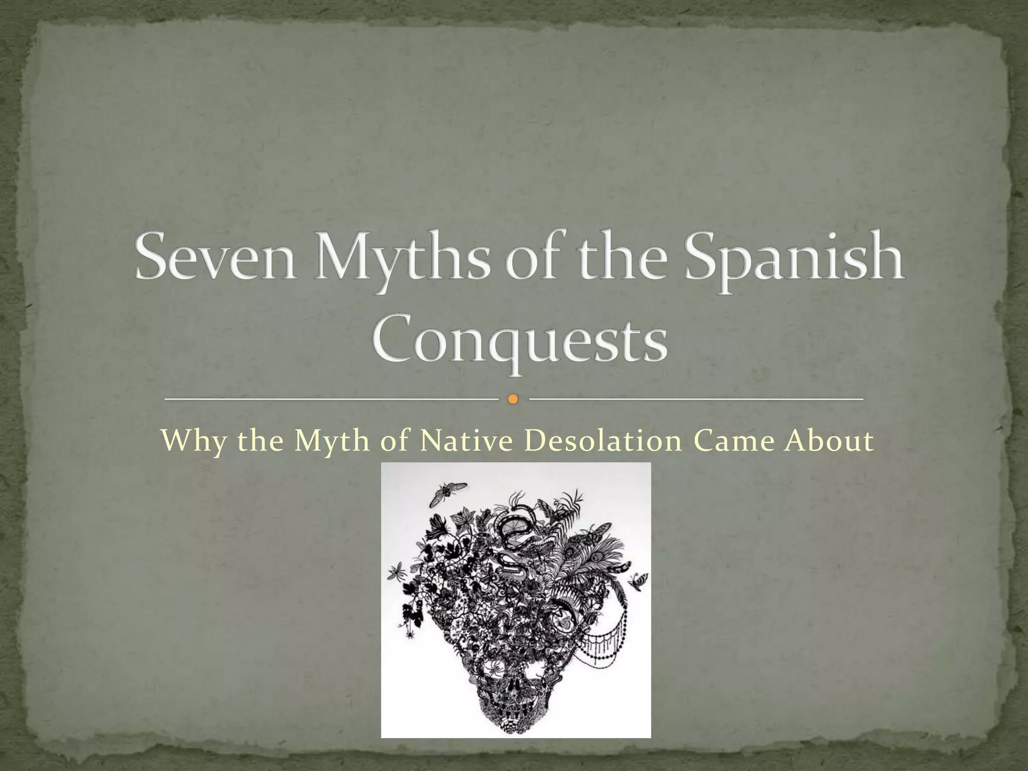The document discusses the myth of native desolation that arose from the Spanish conquests in Latin America. It suggests that Spain benefited politically by appearing powerful through destroying entire civilizations, when in reality disease played a large role in native population losses. Some cultures survived and still exist today, disproving the notion that all indigenous peoples were wiped out. The myth also had economic and social benefits for Spain by encouraging more citizens to settle the New World without fear of native resistance.