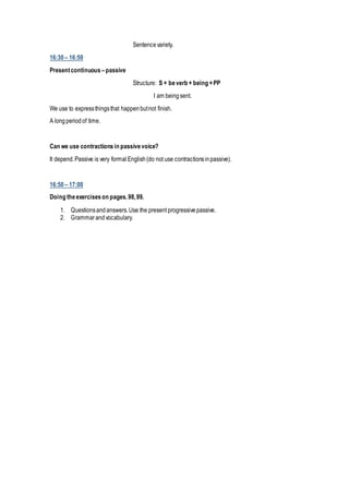 The document outlines the schedule and content covered in an English class. It began with an explanation of transitive verbs and a test on passive voice. Next, the class discussed when to use the simple past passive and its structure. Students then did exercises on putting verbs in the simple past passive and making negatives and questions. A video on passive voice in the past tense was shown, covering reasons to use passive voice. The class continued with a discussion of the present continuous passive, its structure, and uses. Students finished with exercises using the present progressive passive.