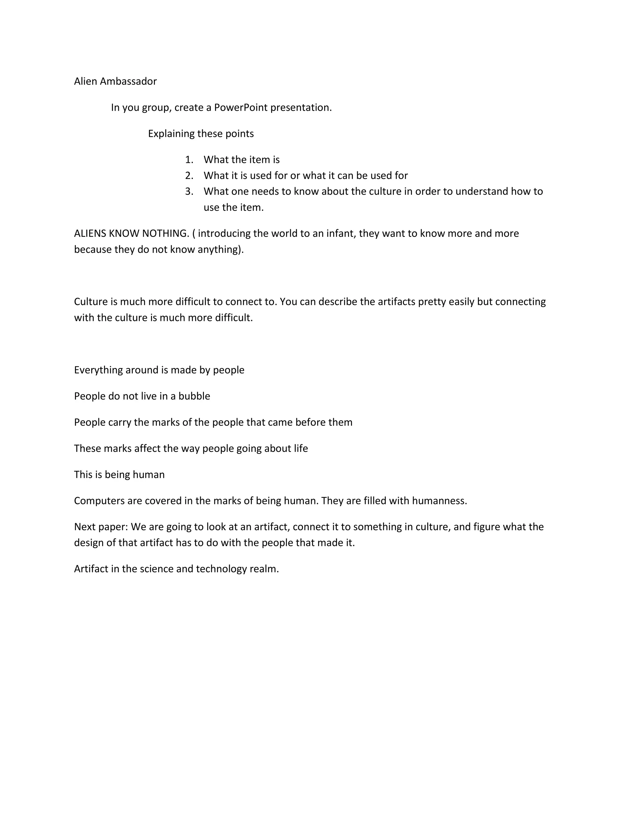 The document provides instructions for an alien ambassador to create a PowerPoint presentation introducing an artifact from human culture. The presentation should define the artifact, its purpose, and the cultural context needed to understand its use. It notes that while describing an artifact is straightforward, connecting it to culture is more difficult, as culture is shaped by history, social norms, and human experiences that computers lack. The presentation aims to help aliens start understanding what it means to be human.