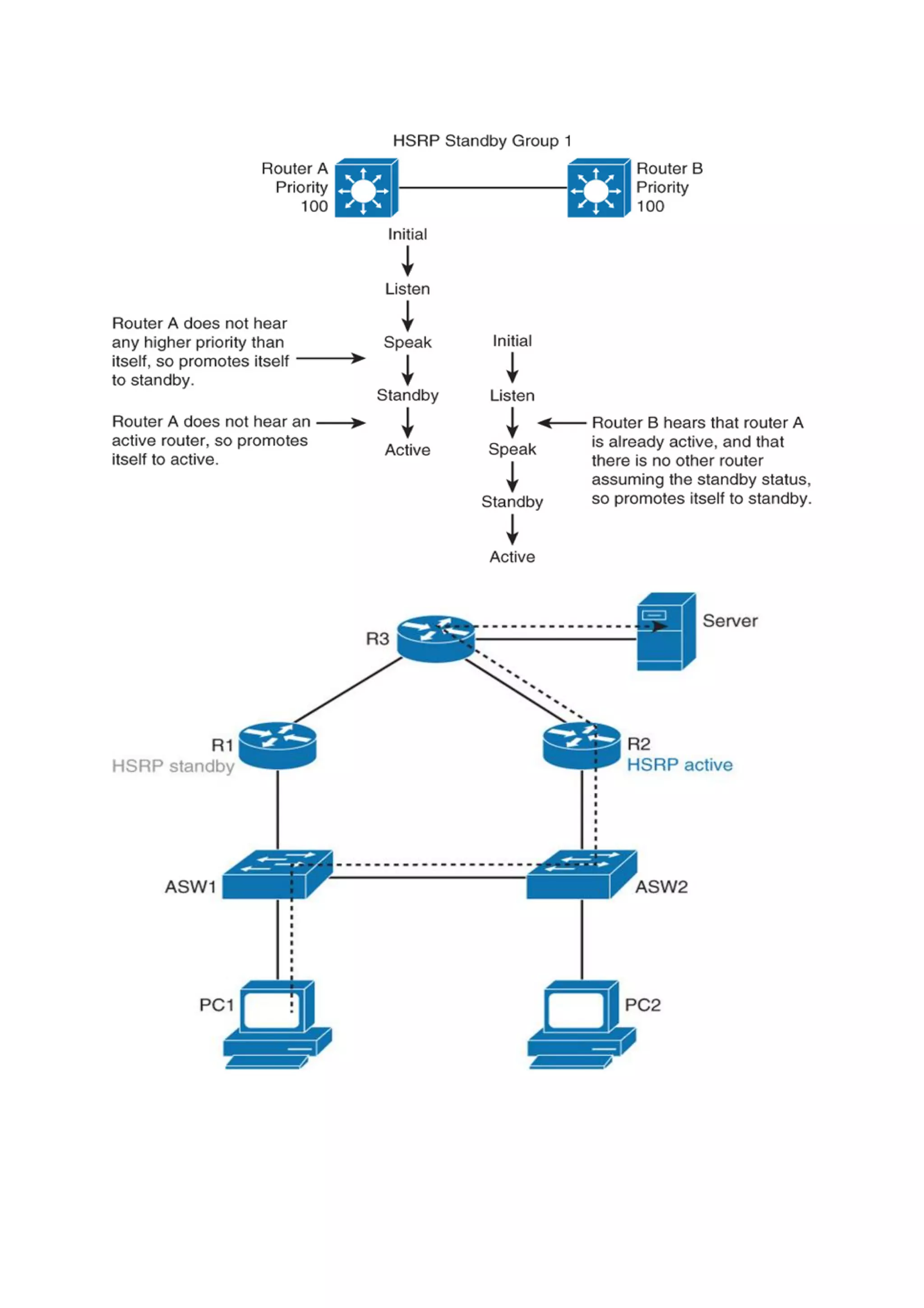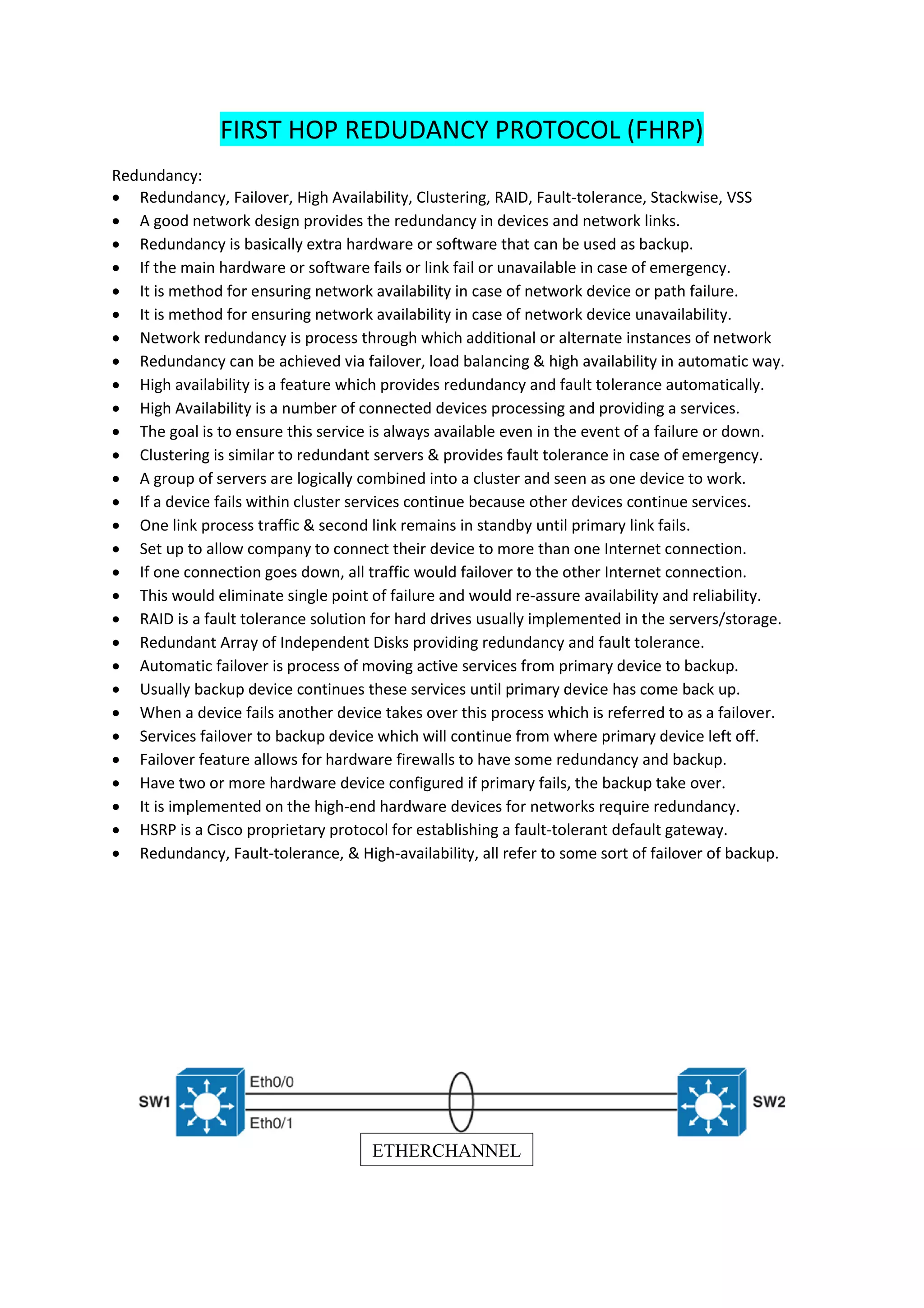 The document discusses first hop redundancy protocols (FHRPs) including Hot Standby Router Protocol (HSRP), Virtual Router Redundancy Protocol (VRRP), and Gateway Load Balancing Protocol (GLBP). HSRP uses a virtual IP address shared between devices to provide redundancy. It elects an active router while others act as standbys. HSRP version 2 supports more groups and milliseconds timers. Link tracking prioritizes routers based on monitored links. FHRPs ensure network availability if a device or path fails.