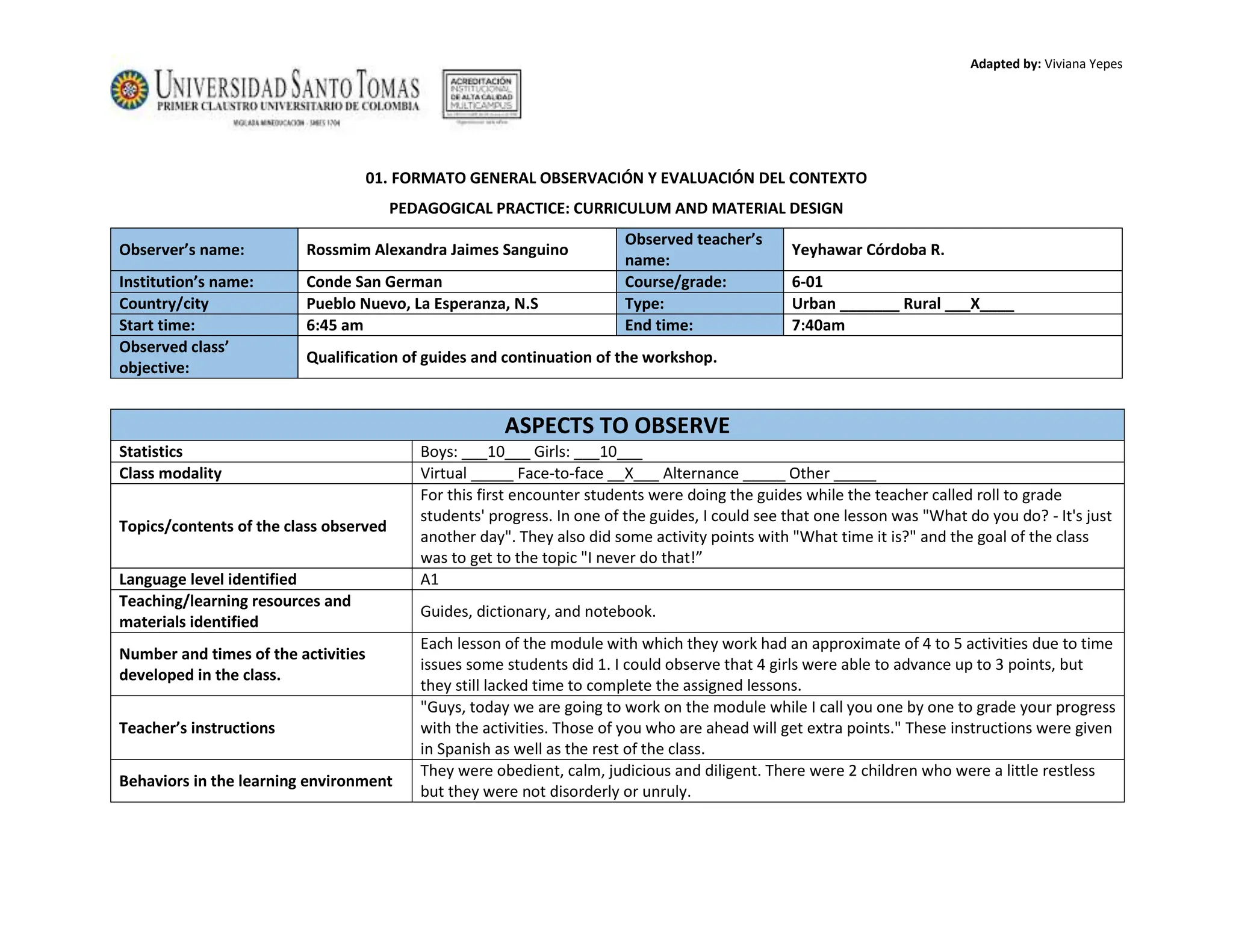 This document summarizes an observation of a 6th grade English class in a rural school in Colombia. The observer notes that the class objective was for students to continue working on guides/worksheets while the teacher called on students one-by-one to check their progress. Students were working on activities related to topics like daily routines and telling time. The teacher's instructions were given in Spanish. Most students behaved well and worked diligently, though a couple were restless. Areas for improvement included the teacher speaking more English, having better organization when checking work, and allowing more time for activity completion.