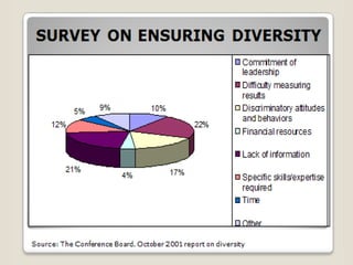 This document discusses diversity and its effects on organizations. It begins with providing background on diversity including relevant legislation and the business case for diversity. Some problems with diversity are then outlined, such as increased costs and potential marginalization of minority employees. The document benchmarks the diversity strategies of two companies, IBM and Pitney Bowes, noting IBM's focus on maintaining multicultural markets and brand image. Recommendations from a 2009 conference emphasize expanding the employee pool, monitoring progress, and using affinity groups for problem solving. The document concludes with an invitation for questions.