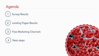 The document summarizes the results of market research conducted for a new food delivery service called Chief Food Officers. According to the survey results, 61% of respondents would order at least once a month, 78% prefer medium food quality, and 29% find the idea excellent. The landing pages achieved a 12-14% conversion rate. Free marketing channels identified include blogs, social media, communities, PR, and email. Next steps include contacting Resto-in to discuss logistics, interviewing more restaurants, implementing marketing channels.