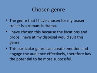 The chosen genre is a romantic drama, which can engage audiences emotionally and has potential for success given the locations and props available. The teaser trailer takes ideas from The Time Traveler's Wife and One Day, which both depict a man and woman falling in love despite obstacles like time travel or living separate lives after university. Key codes and conventions include relatable main characters, a theme of true love despite challenges separating the couple, lighting and music used to set mood, and seasonal settings reflecting happy versus sad scenes. The proposed storyline follows a boy and girl who fall in love in university but have separate career paths as they struggle to hold onto their love for each other.