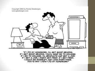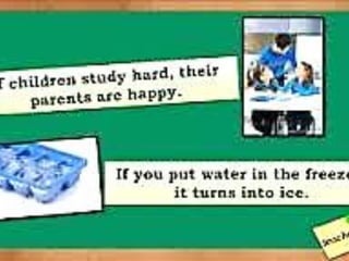 Conditional sentences have two clauses: an if-clause and a main clause. There are different types of conditional sentences depending on the tenses used. A zero conditional uses present tense in both clauses to describe universal truths or scientific facts. A first conditional uses a present tense if-clause and a future tense main clause to talk about possible future events, make promises, or give warnings.