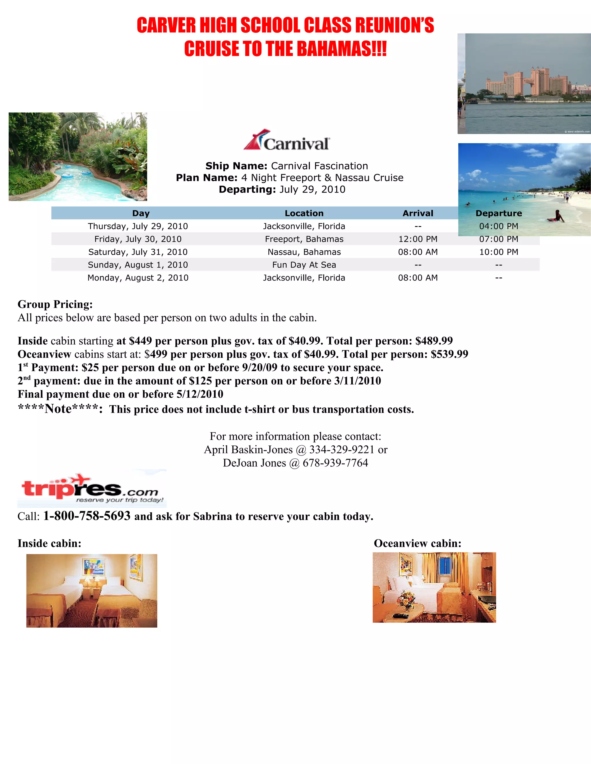 The document announces a class reunion cruise for Carver High School alumni departing from Jacksonville, Florida on July 29, 2010 aboard the Carnival Fascination. The 4-night cruise will make stops in Freeport and Nassau, Bahamas with prices starting at $449 per person for an inside cabin and $499 per person for an oceanview cabin, not including taxes, fees, or transportation costs. A $25 deposit is due by September 20, 2009 with subsequent payments on March 11 and May 12, 2010 to reserve a cabin.