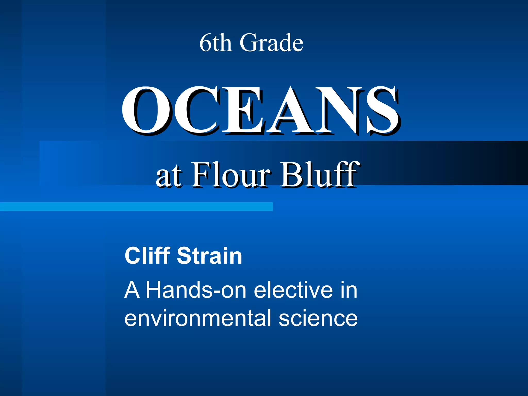 This document provides an overview of an environmental science elective class for 6th grade students focused on the marine environment. The class goals are to give students an overview of the marine environment and relationships within it, teach students how to collect, identify and classify marine life, and provide students an opportunity to compare and contrast body structures of animals in relation to function, classification, and adaptation. Students spend the first four weeks learning physical and chemical oceanography fundamentals. They then go seining every other Friday to learn proper specimen handling and identification techniques. Later, students explore animal structure and function through dissections and observations. The class culminates in an imaginary boat race where students apply navigation, teamwork, and decision-making skills.