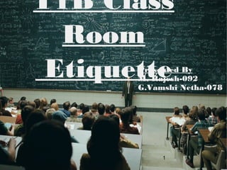 The document outlines etiquette tips for proper classroom behavior. It defines etiquette as customary codes of polite behavior. Some tips provided include respecting others, avoiding cell phone use and side conversations, being on time and prepared, dressing appropriately, keeping the classroom neat and tidy, paying attention, and not sleeping or chewing gum in class. Students are advised that their instructors are always watching and they should seek assistance instead of commenting on others' questions.