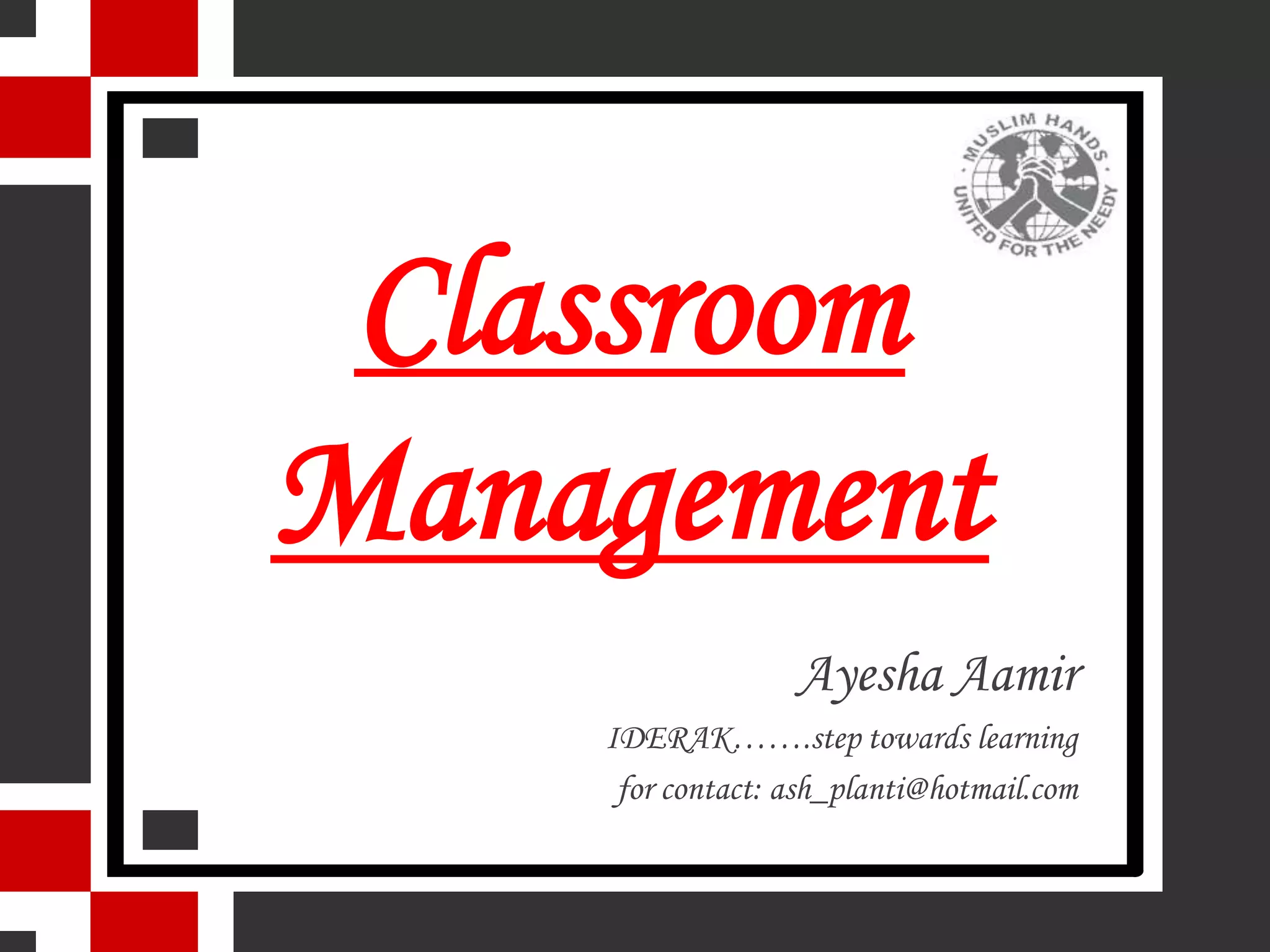 This document discusses the importance of classroom management for effective teaching and learning. It provides several key points about classroom management, including that teachers should plan their lessons with students in mind and focus on engaging students. Discipline, rather than punishment, is emphasized as a better approach for changing unwanted student behaviors. Four guiding principles of classroom management are outlined: focusing on student achievement, applying a three-tiered prevention model, linking classroom management to school-wide systems, and teaching social skills like academic skills. Overall, the document stresses the significance of classroom management for student success and engagement.
