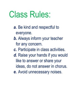 The document outlines classroom rules focusing on kindness, respect, and communication. Students are encouraged to inform the teacher of concerns, participate in activities, raise their hands to speak, and minimize noise. These guidelines aim to create a positive and orderly learning environment.