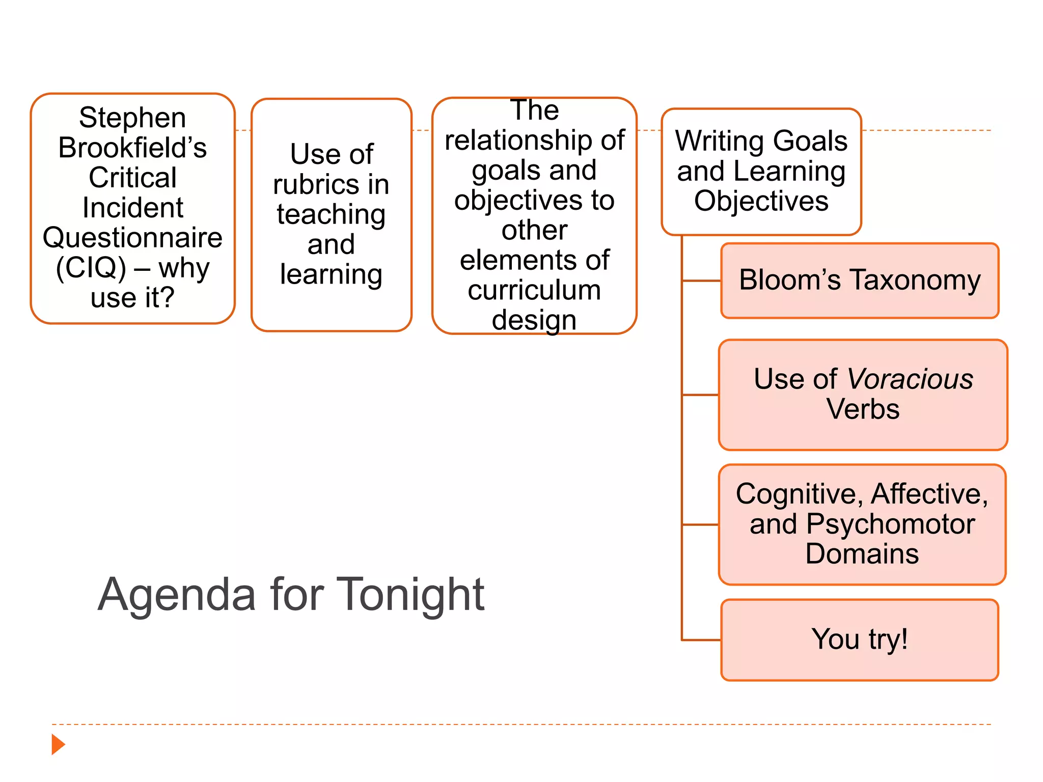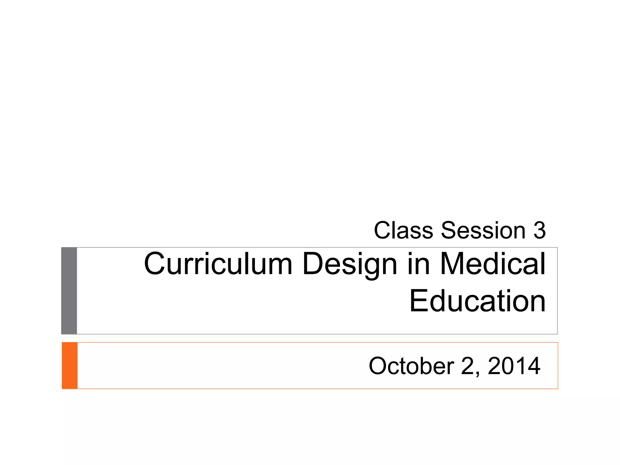 This document discusses curriculum design in medical education. It provides an agenda for the class session which includes discussing Brookfield's Critical Incident Questionnaire, the use of rubrics in teaching and learning, and writing goals and learning objectives. It then discusses using rubrics for assessment and providing feedback to students. Key aspects of rubrics like dimensions and achievement levels are outlined. The relationship between goals, objectives, instructional strategies, feedback and assessment in integrated course design is discussed. Writing goals, objectives, Bloom's taxonomy, and examples of learning objectives are also covered.