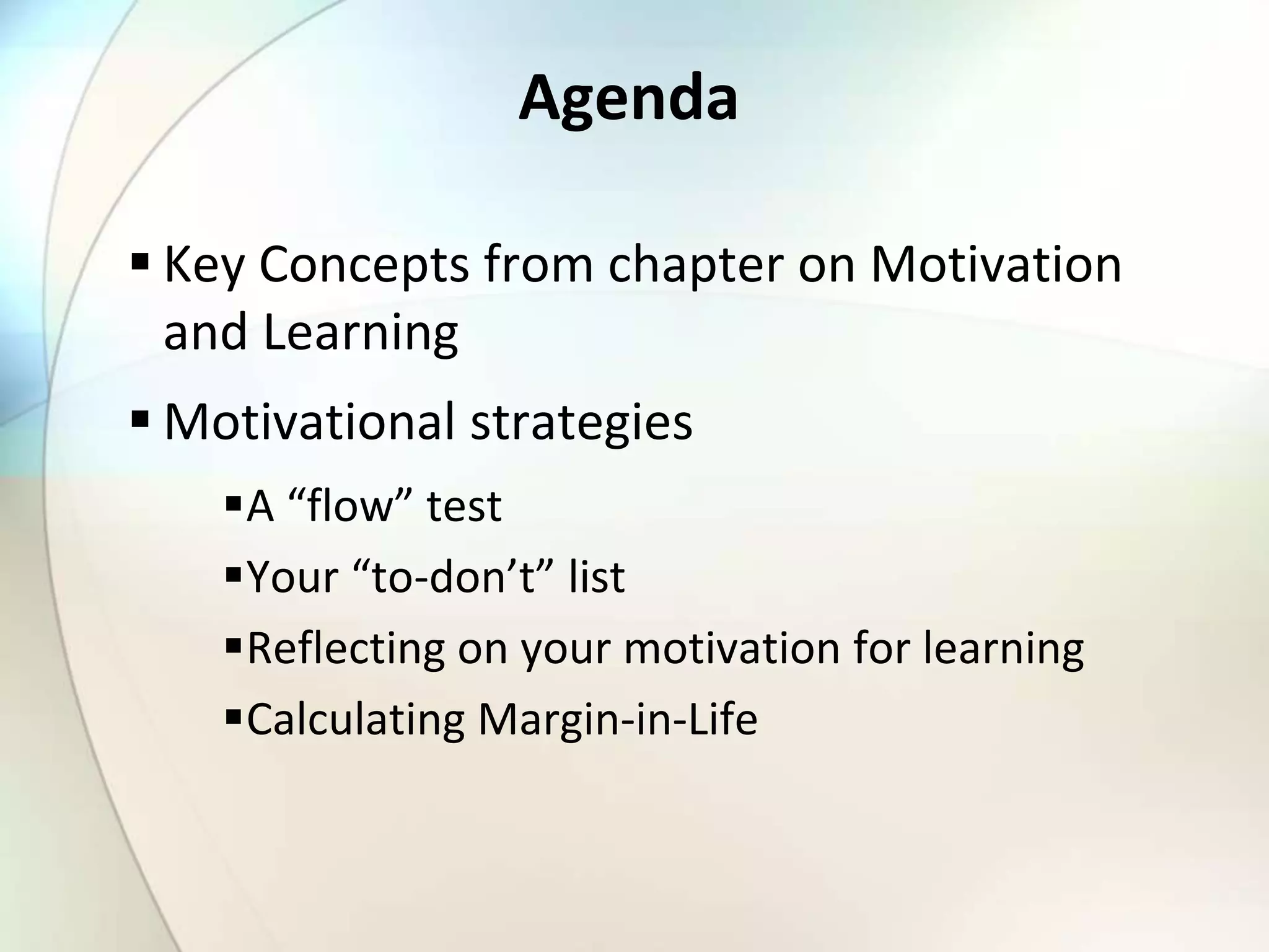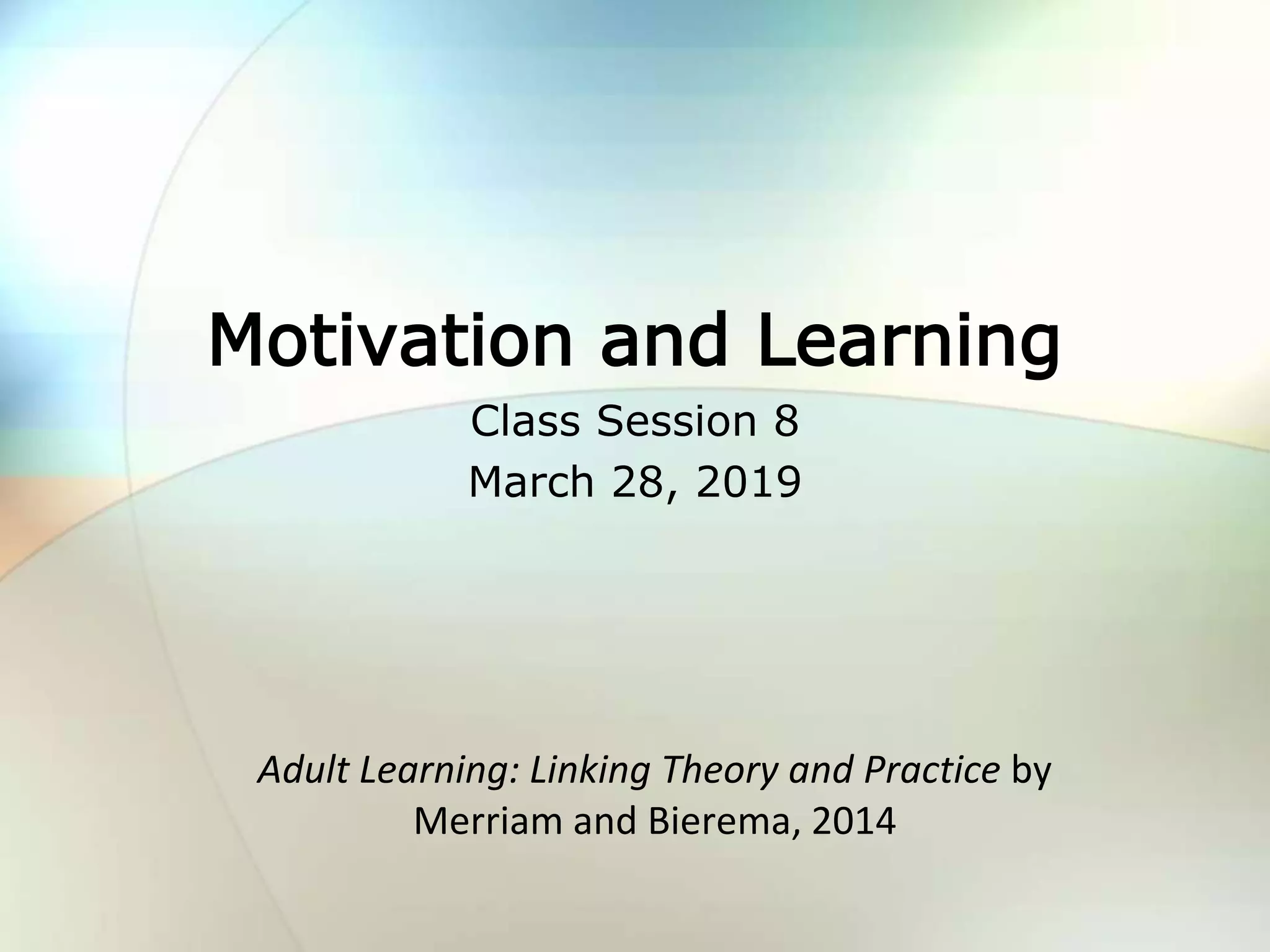 This document summarizes key concepts from a chapter on motivation and learning in adult education. It discusses classical motivation theories, the concept of "flow" involving complete focus and engagement, and factors that influence motivation like autonomy, mastery and purpose. It also addresses minimizing instructor-generated cognitive load on learners and conditions for motivating learners, such as inclusion, building positive attitudes, meaning creation and demonstrating competence. Strategies are provided for instructors to enhance learner motivation through expertise, empathy, enthusiasm, clarity and respect.
