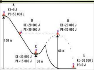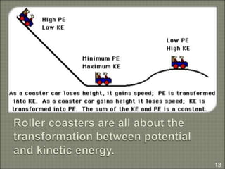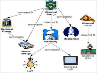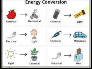 The document explains the concepts of energy and work, highlighting their definitions, measurements, and relationships. It describes various types of energy including mechanical, heat, light, chemical, sound, magnetic, electrical, and atomic energy, alongside examples and formulas for potential and kinetic energy. Additionally, it covers the conversion of energy between forms, conservation of energy principles, and practical applications like hydroelectricity.