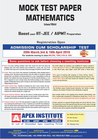 Dear Students/Parents We at 'Apex Institute' are committed to provide our students best quality education with ethics. Moving in this direction, we have decided that unlike other expensive and 5star facility type institutes who are huge investors and advertisers, we shall not invest huge amount of money in advertisements. It shall rather be invested on the betterment, enhancement of quality and resources at our center. We are just looking forward to have 'word-of-mouth' publicity instead. Because, there is only a satisfied student and his/her parents can judge an institute's quality and it's faculty members coaching. Those coaching institutes, who are investing highly on advertisements, are actually, wasting their money on it, in a sense. Rather, the money should be invested on highly experienced faculty members and on teaching gears. We all at 'Apex' are taking this initiative to improve the quality of education along-with each student's development and growth. Committed to excellence... With best wishes. S . Iqbal ( Motivator & Mentor)