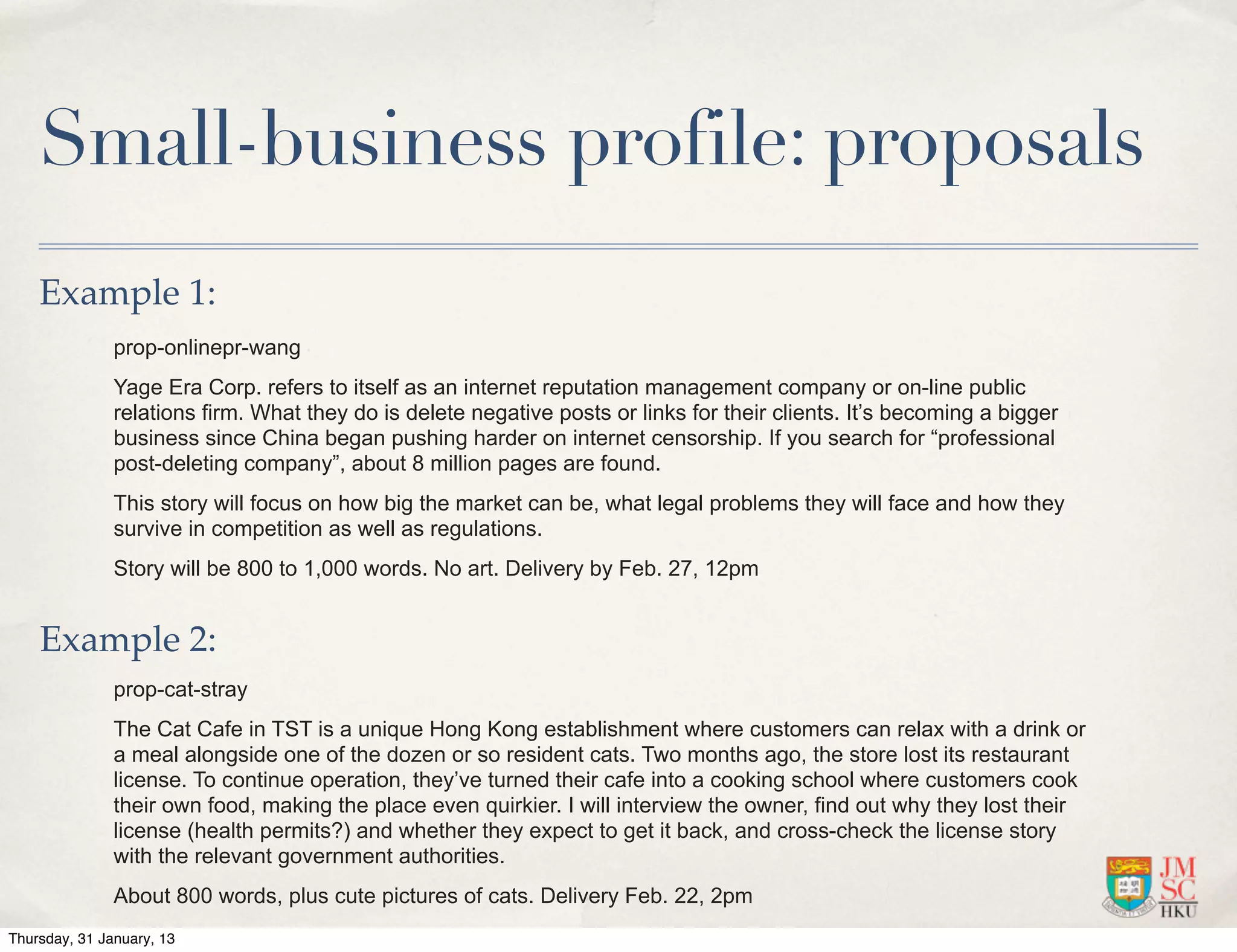 The document contains three proposals for small business profiles to cover: