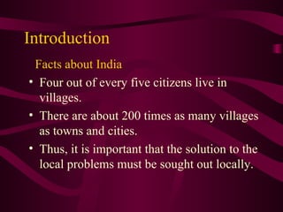 The document summarizes self-governing bodies in rural areas of India. It explains that four out of five Indians live in villages, so local problems require local solutions. The main self-governing bodies are gram panchayats at the village level, block samitis at the block level, and zila parishads at the district level. Their functions include providing clean water, sanitation, roads and other infrastructure, and supporting programs like healthcare, education, and adult literacy. Gram panchayats fund their activities through taxes, government grants, and loans.