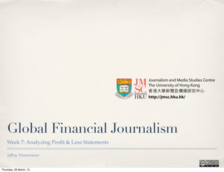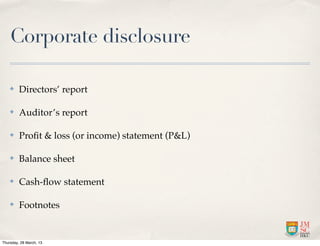 The document provides an overview of analyzing corporate profit and loss statements. It discusses key components of a P&L statement such as revenue, expenses, profit, earnings per share, and how it shows the path from revenue to net profit. It also discusses interpreting P&L statements, including checking footnotes and understanding the treatment of items like depreciation, subsidiaries versus associates, and minority interests. An example P&L statement is then presented for Hutchison Whampoa Limited to demonstrate these concepts.