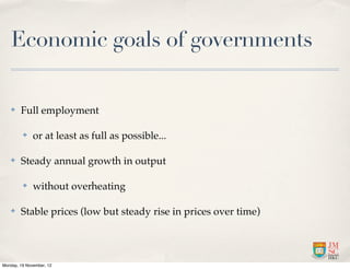 The document discusses key economic indicators such as GDP, CPI, unemployment rates, and confidence indexes. It explains how governments and central banks use tools like fiscal policy, monetary policy, interest rates, and reserve ratios to influence economic goals of steady growth, low unemployment, and stable prices. Specific indicators covered in depth include CPI, which can have issues due to arbitrary baselines and basket changes over time, and unemployment rates, which don't include discouraged workers.