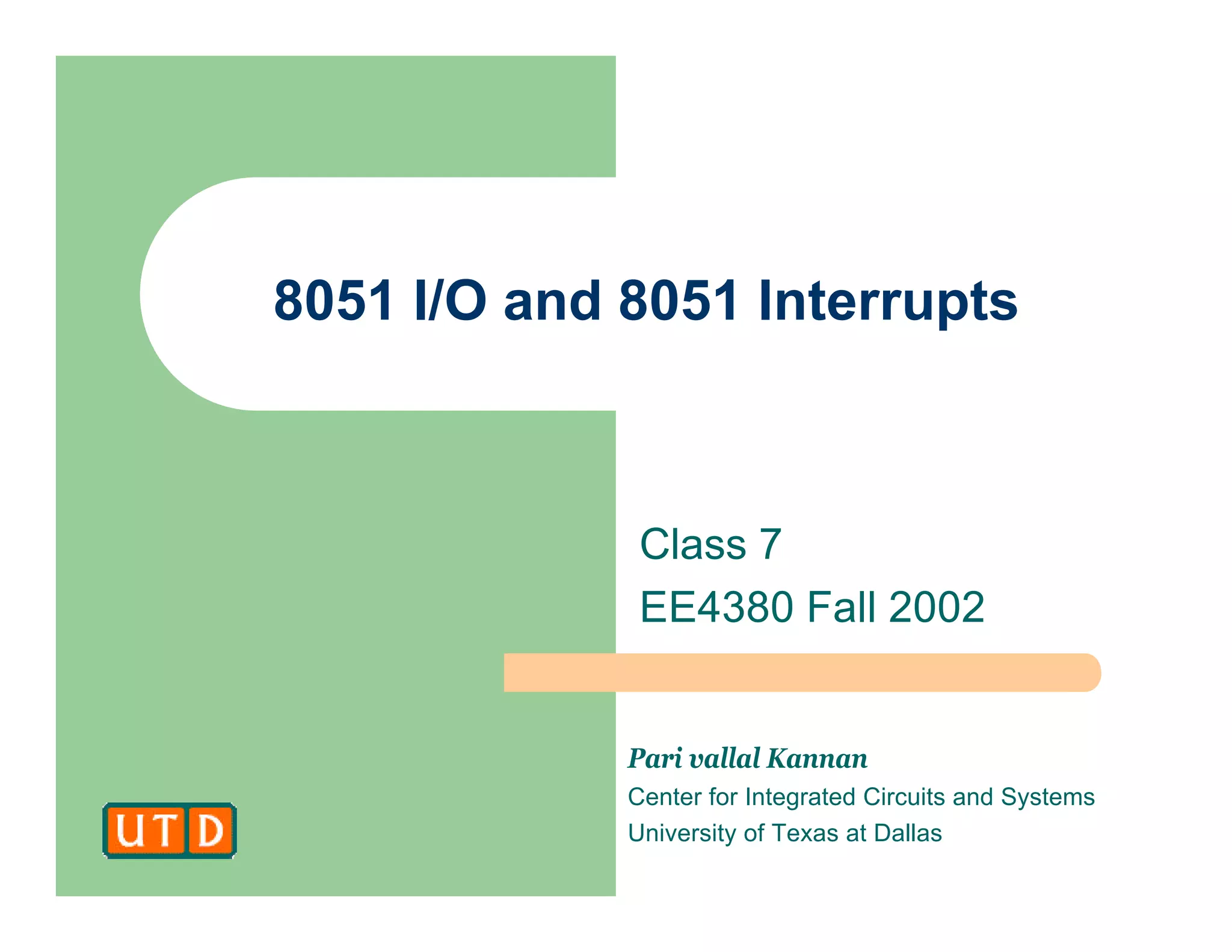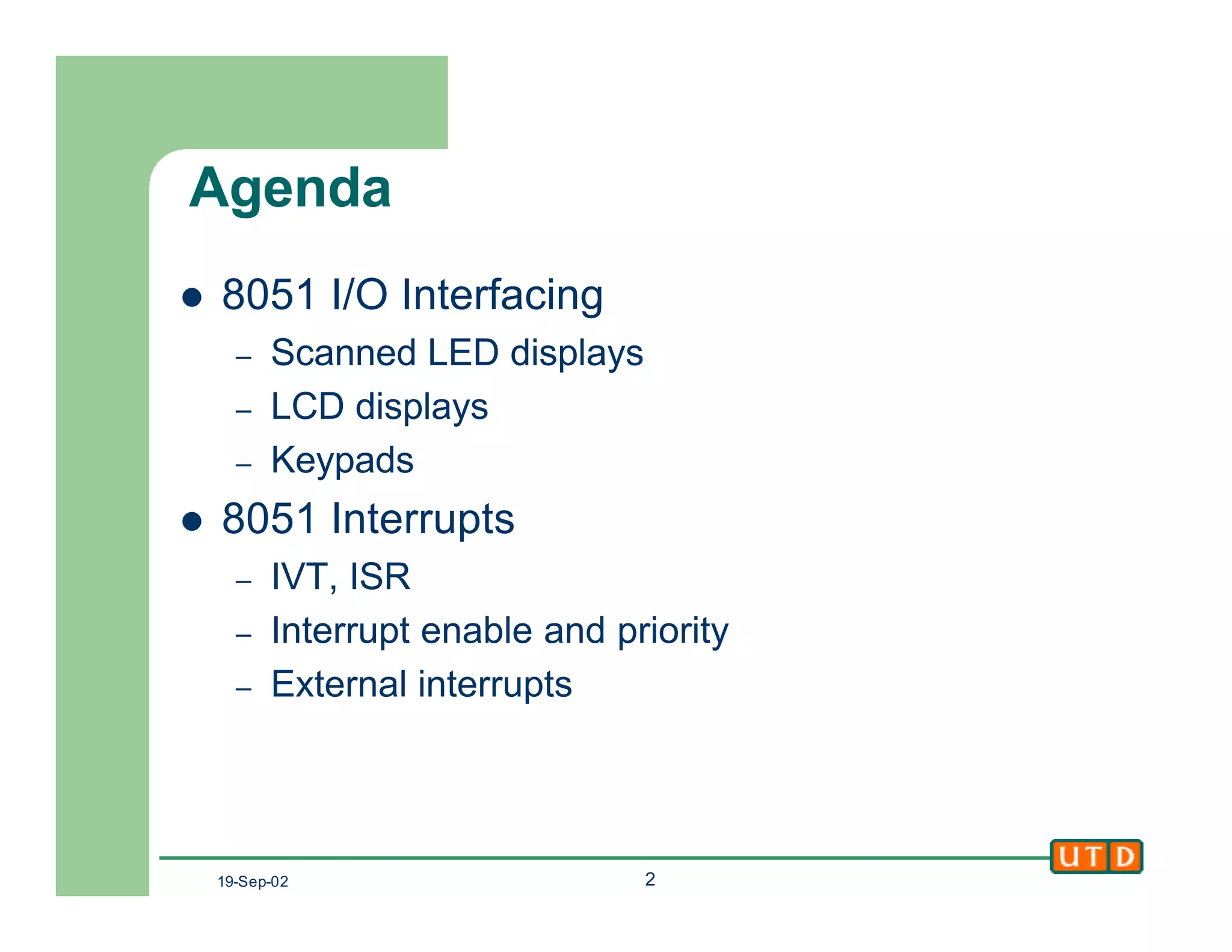 This document provides an overview of 8051 I/O interfacing and interrupts. It discusses scanned LED displays, LCD displays, keypads, and the 8051 interrupt vector table, interrupt service routines, interrupt enable register, external interrupts, and interrupt priority. Specific examples are given for interfacing 7-segment LED displays, keypads, and alphanumeric LCDs. Interrupts are compared to polling, and the execution of interrupts is explained.