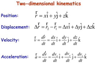 - The document outlines topics to be covered in a class review on motion in 2D and 3D, including exam instructions, example problems, and key concepts like position, velocity, acceleration, projectile motion, uniform circular motion, and relative motion.