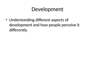development refers to economic growth, education, healthcare, and infrastructure improvement.
