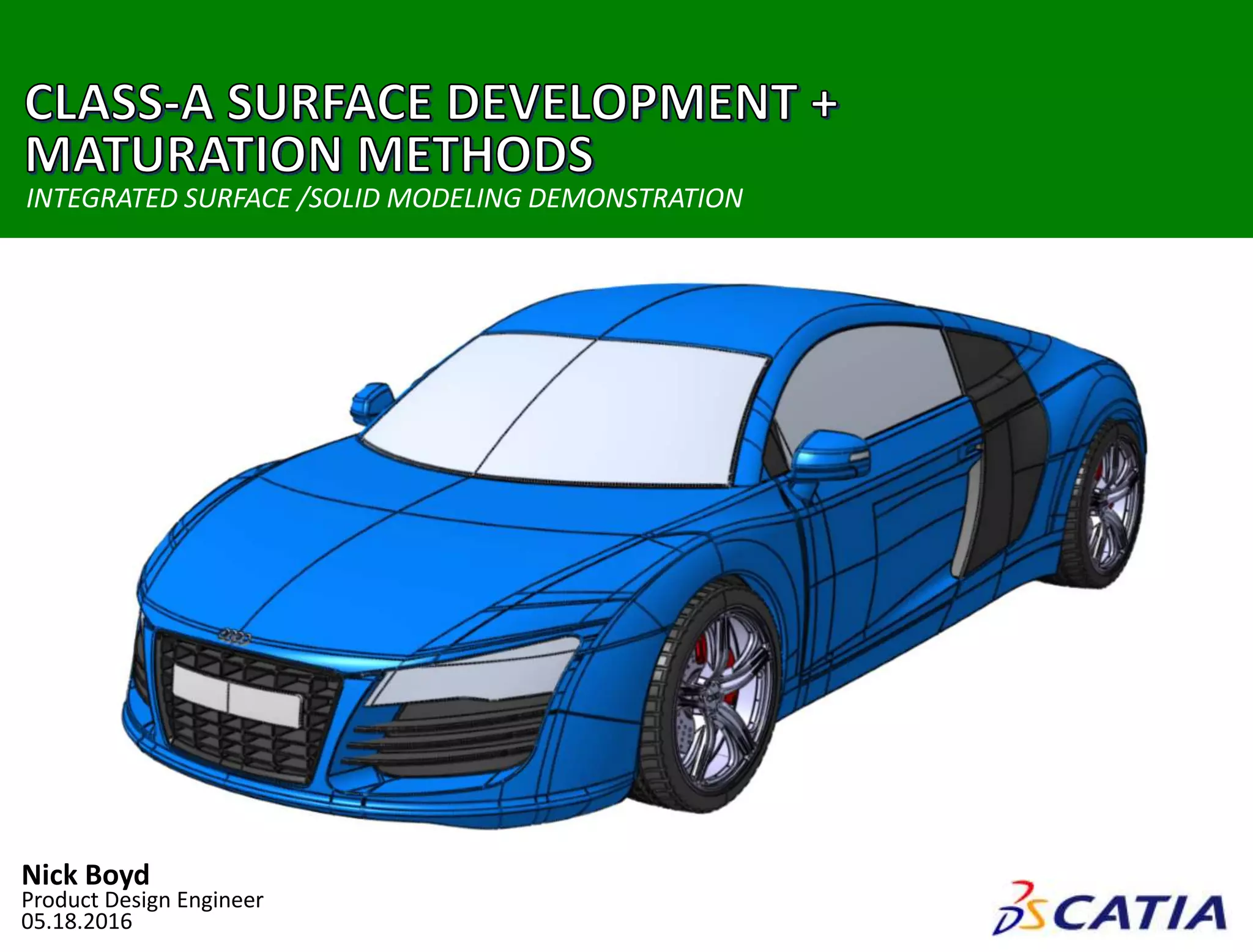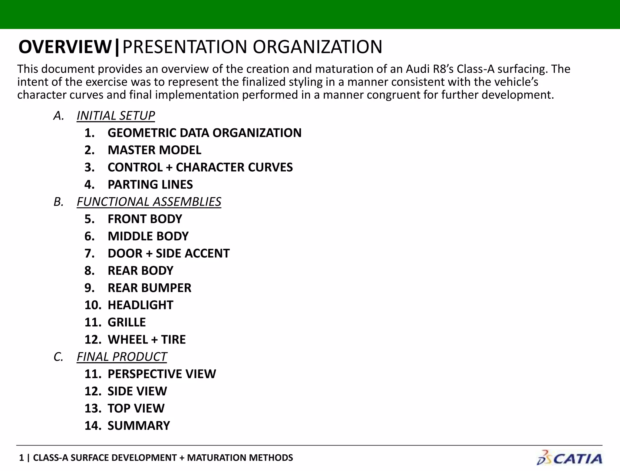 The document describes the process of developing Class-A surfaces for an Audi R8 model through integrated surface and solid modeling. The process began by organizing geometric data and creating master models, control curves, and parting lines. Surfaces were then constructed for functional assemblies like the front body, doors, and rear bumper through techniques such as splitting, filing, and trimming. The final product was generated with perspectives, side, and top views that replicated the styling of the original vehicle design.