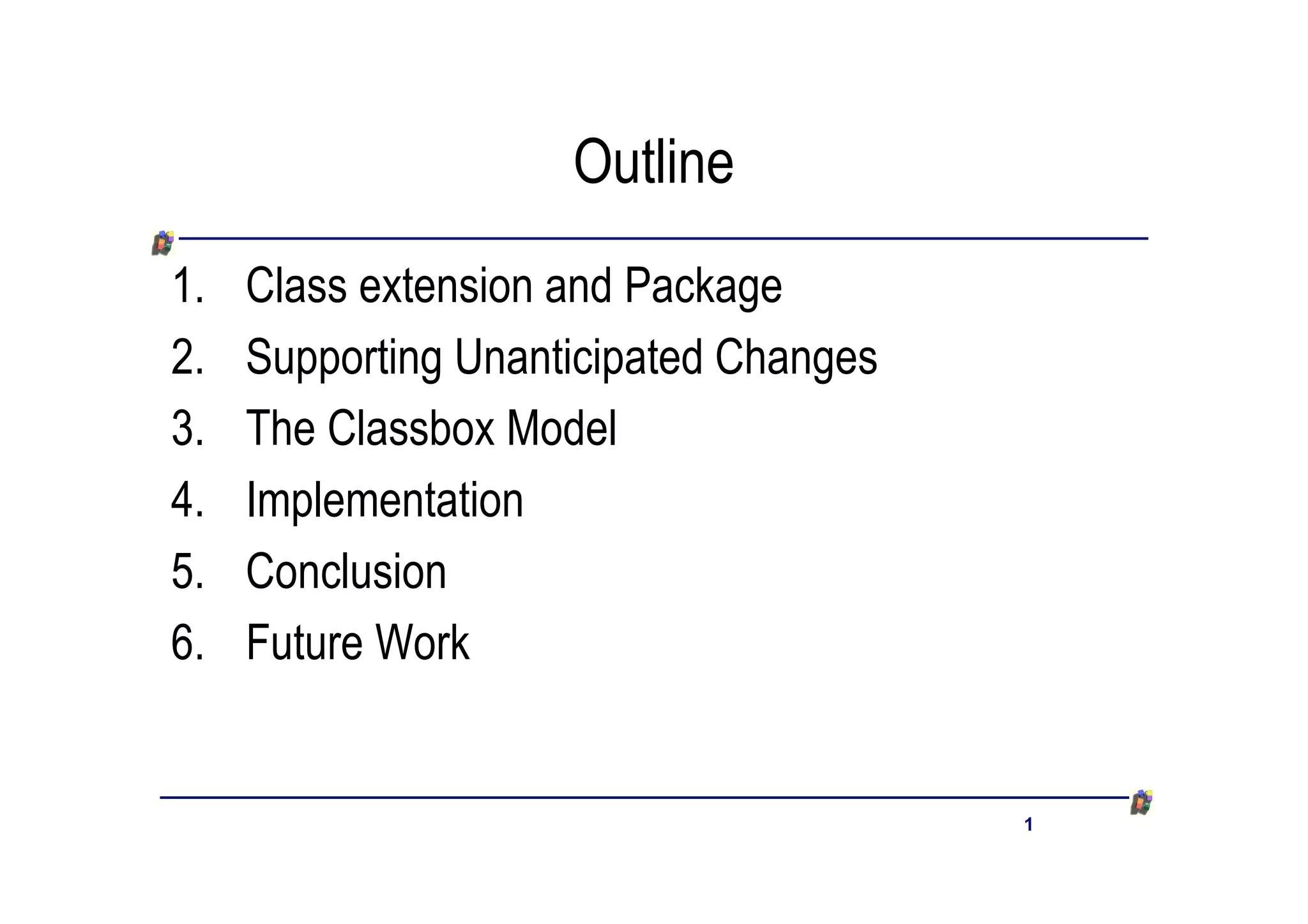 The document proposes the Classbox model, a minimal module model that supports local class extension. A Classbox acts as a namespace that can define classes and methods, with classes and methods belonging to exactly one Classbox. By making class extensions local to a Classbox, conflicts are avoided. The model also allows controlling class extensions and applying unanticipated changes without breaking existing clients. The implementation in Squeak modifies the VM for efficient method lookup based on Classbox imports before inheritance. Future work includes refining visibility control and formalizing the flattening property.