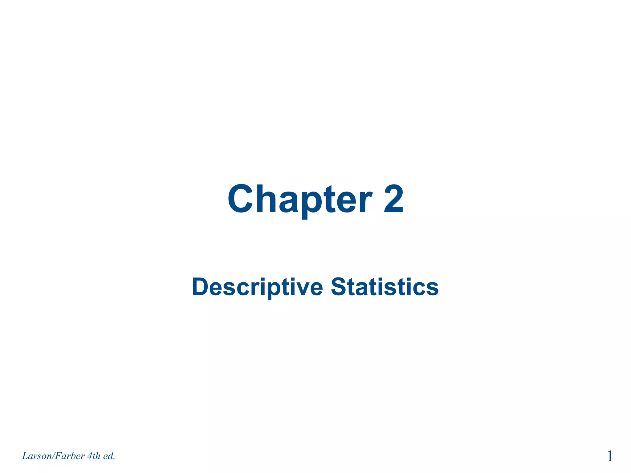 This document summarizes Chapter 2 of a statistics textbook. It covers descriptive statistics including frequency distributions, graphs of distributions, measures of central tendency, variation, and position. Section 2.1 discusses constructing frequency distributions and graphs including histograms, polygons, relative histograms, and ogives. Examples are provided to demonstrate how to construct these graphs from sample data on internet usage times. Key steps include determining class widths, limits, frequencies, midpoints, boundaries, and plotting the graphs.