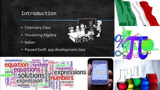 The document provides summaries of various classes taken by the author, including chemistry, visualizing algebra, and Italian. For chemistry, they attended class 5 days a week, did labs and homework, and learned chemistry, math, and lab skills. For visualizing algebra, they completed video lessons and exercises for 1 hour per day 6 days a week, totaling over 168 hours. For Italian, they listened to audio for 1 hour per week and did computer exercises for vocabulary, phrases, and speaking practice. They also briefly discussed a chemistry experiment and solving a quadratic equation in algebra.