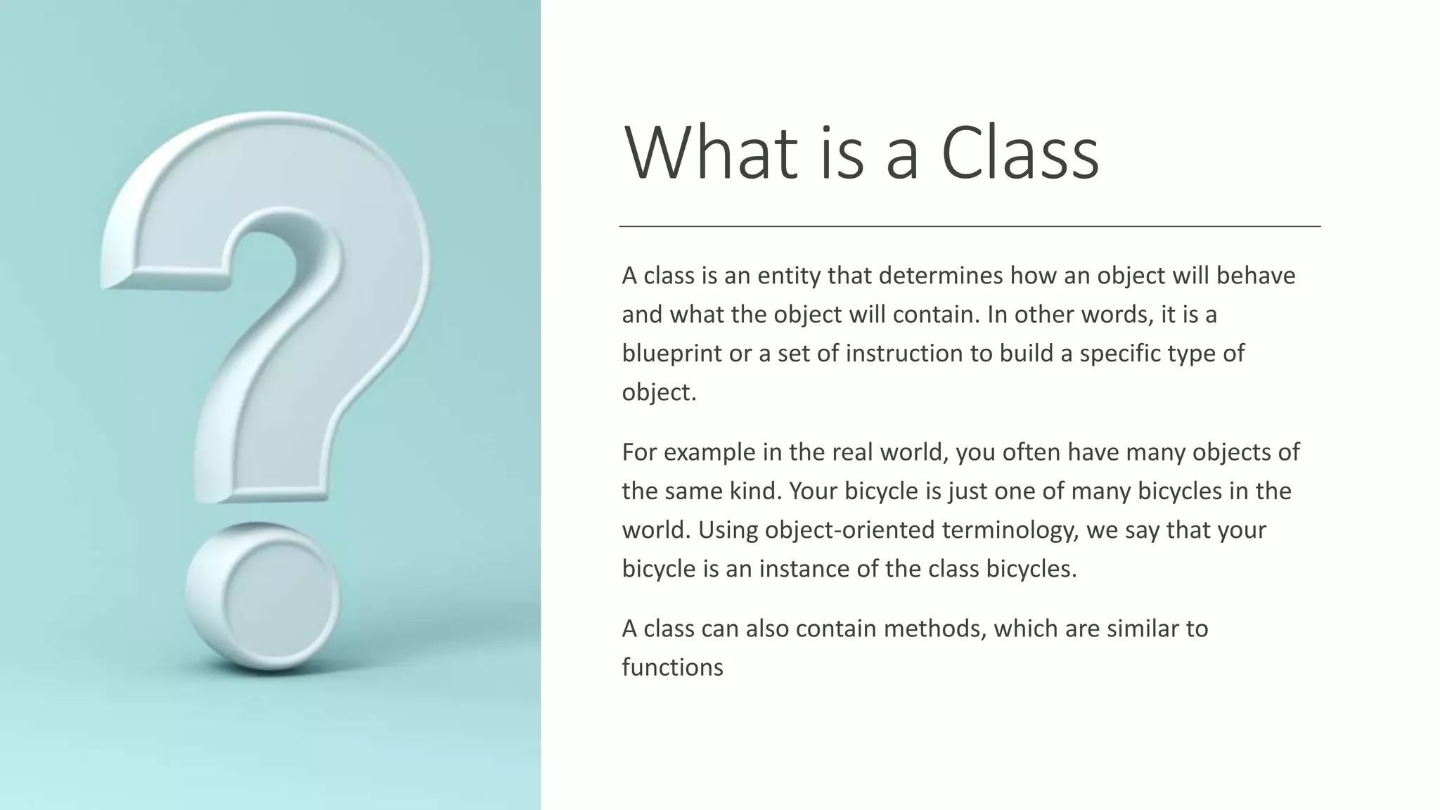 This document discusses classes and objects in object-oriented programming. It defines a class as a blueprint or set of instructions for building objects of a specific type. An object is an instance of a class - for example, a specific bicycle would be an object of the Bicycle class. The document then demonstrates how to define a Bicycle class with attributes like color and weight, and how to create Bicycle objects by initializing them with attributes. It also discusses class methods and the relationship between classes.