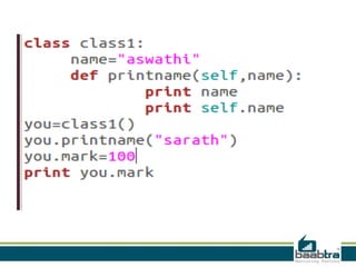 This document provides an overview of classes and objects in Python. It defines a class as a way to bind data and functions together. An object is an instance of a class and represents an entity with unique identity, state, and behaviors. The document discusses class attributes like __dict__, __doc__, and __name__. It also covers access specifiers like private, protected, and public and provides examples of declaring a class and defining methods in Python.