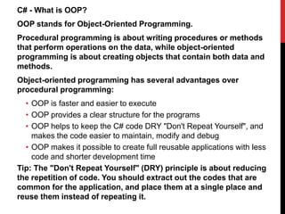 OOP stands for Object-Oriented Programming. It involves creating objects that contain both data and methods. Classes act as templates for objects and define their attributes and behaviors. Some advantages of OOP include reusability, organization, and reduced repetition of code. Classes contain fields to store data and methods to perform actions on that data. Objects are instances of classes that inherit all fields and methods. Constructors initialize objects and can set initial field values. Arrays can store multiple objects. Dynamic arrays allow adding elements at runtime. Partial classes allow splitting a class definition across multiple files.