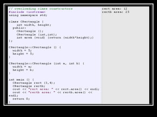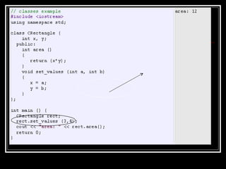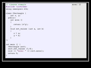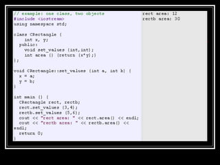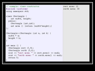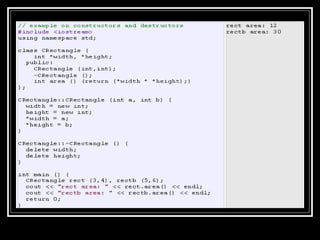 A class defines a data structure that can contain both data and functions as members. An object is an instance of a class that allocates memory for the class's data members. Classes allow the declaration of multiple objects that each have their own copies of the class's data members and can access the class's member functions. Constructors initialize an object's data members when it is created, while destructors perform cleanup tasks when an object is destroyed.