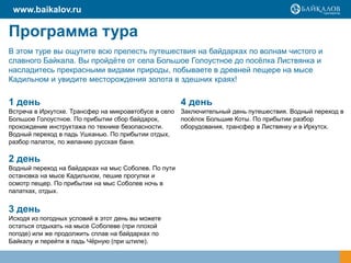Тур на байдарках по Байкалу предлагает уникальные приключения в летний сезон 2013 года, включая водные переходы, пешие прогулки, а также посещение живописных мест, таких как мыс Кадильный и мыс Соболев. Путешествие длится 4 дня и включает в себя питание, размещение в палатках и услуги опытного инструктора. Стоимость тура варьируется в зависимости от размера группы, с включением трансферов и снаряжения для сплава.