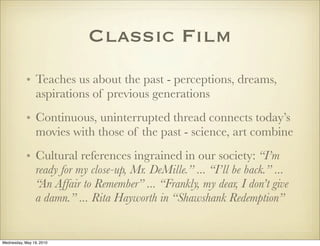 Classic films teach us about past generations' perceptions and provide cultural references still used today. They illustrate the evolution of cinema from early illusions of motion to full narratives and Hollywood studios. Key developments included silent films, talkies, color, special effects innovations, and the rise of genres like film noir. Iconic films from all eras like Citizen Kane, Casablanca, and more cement cinema's lasting influence and importance to study.