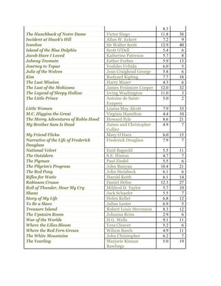 This document provides a reading list of classic literature for middle school students, divided into four sections. The first section introduces classic novels that introduce new characters and worlds. The second lists older classics for children, including works by Alcott, Carroll, Dickens and others. The third section highlights contemporary classics from the 1970s onward. The final section recommends additional classic titles across genres. The lists include point values to indicate reading difficulty levels.