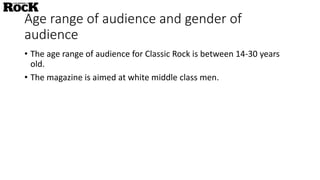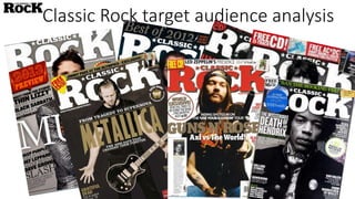 The target audience for Classic Rock magazine is white middle class men between 14-30 years old. They enjoy rock, indie, alternative, and folk genres performed by artists like Guns N' Roses, Muse, The Rolling Stones, and Deep Purple. They have styles typical of rock fans such as leather jackets, Converse shoes, skinny jeans, and mostly black clothes. Their jobs include teachers, accountants, business owners, and nurses. Their hobbies include attending concerts, tours, gigs, and music festivals of their favorite artists.