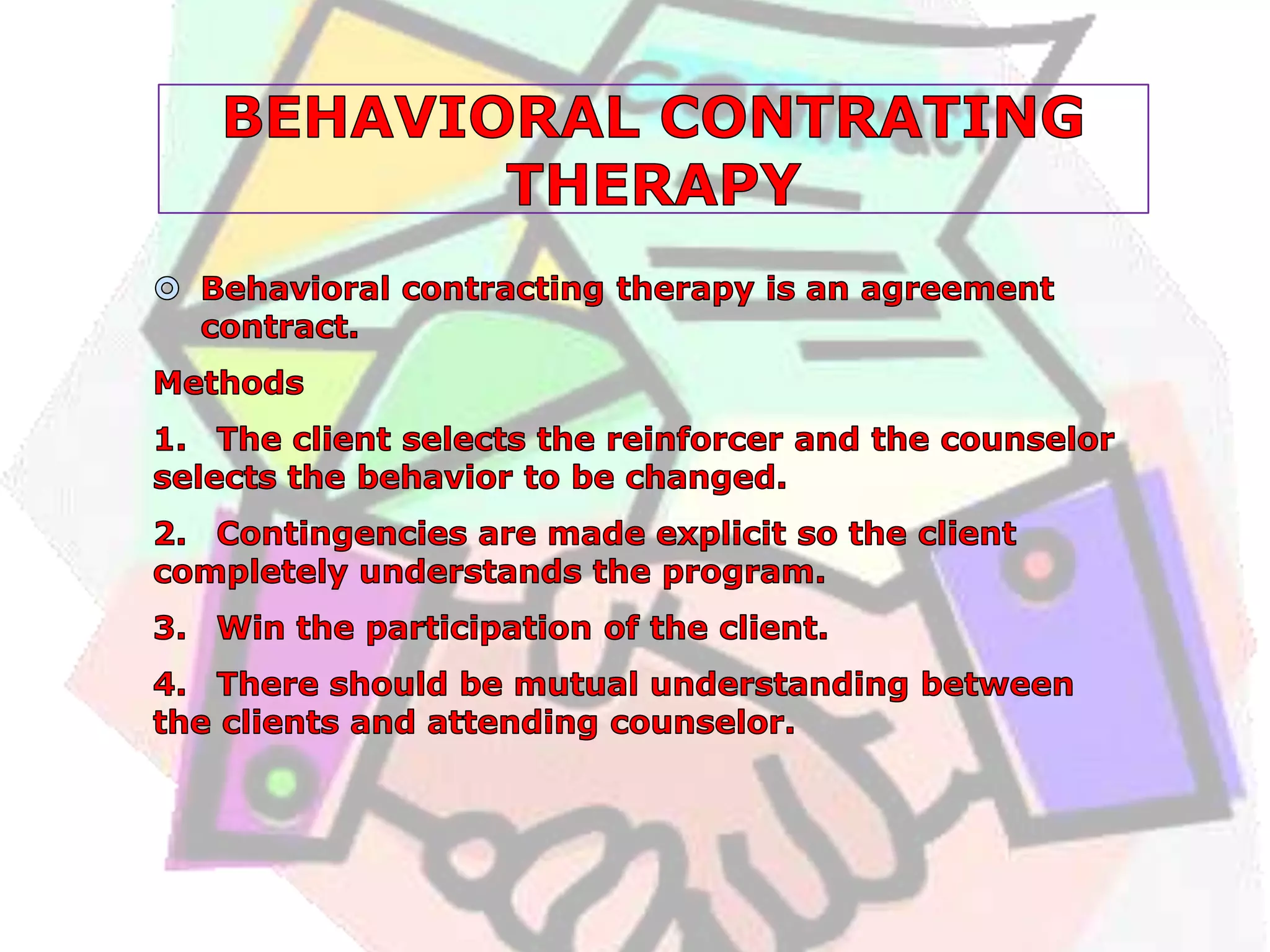 The document discusses behavioral counseling focusing on classical and operant conditioning to change ineffective behaviors into effective ones. It covers key concepts such as reinforcement, systematic desensitization, aversion therapy, and various techniques used in behavioral modification like token economy and shaping. The text emphasizes the advantages of these conditioning therapies in dealing directly with behavioral symptoms in clients.