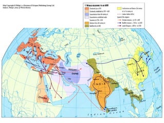 Historians view belief systems in the context of the time and place. Religions both influence and are influenced by culture as they spread. The document discusses the foundations and spread of several classical belief systems including Hinduism, Buddhism, Zoroastrianism, Judaism, Christianity, Daoism, and Greek Rationalism. As religions spread to new regions, they sometimes changed or split into different sects under new cultural influences.