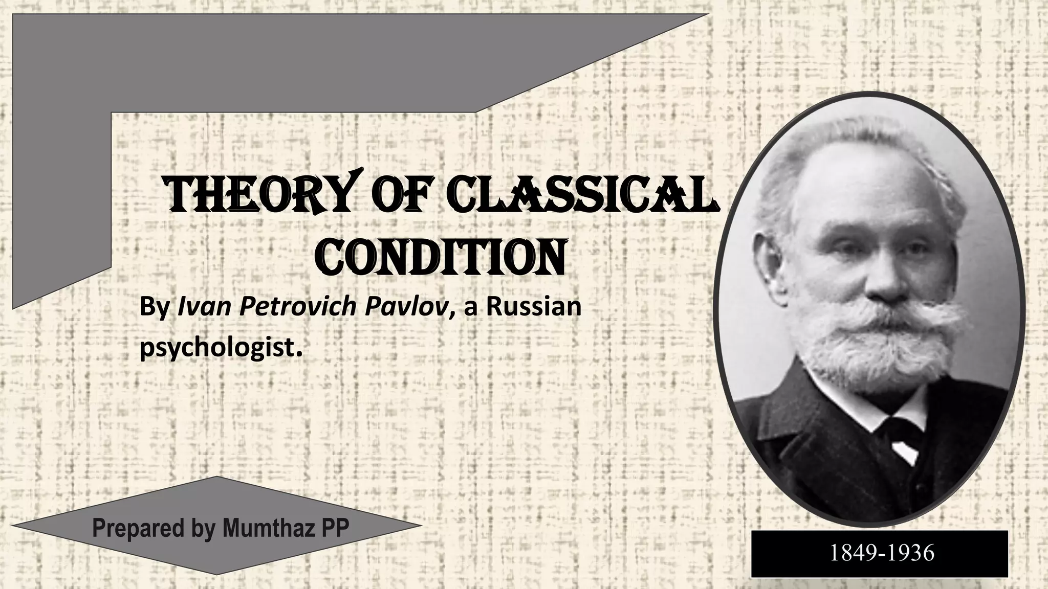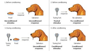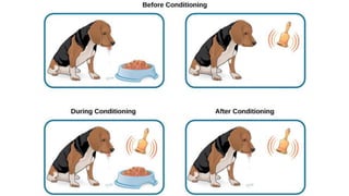 The document outlines Ivan Pavlov's theory of classical conditioning, detailing his experiments with dogs that demonstrated the association between stimuli and responses. Key concepts include unconditioned stimulus, unconditioned response, conditioned stimulus, and conditioned response, along with principles such as reinforcement, extinction, and spontaneous recovery. The theory has important educational implications, particularly in developing positive behaviors and addressing issues like anxiety and phobias.